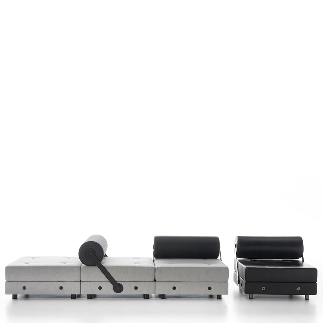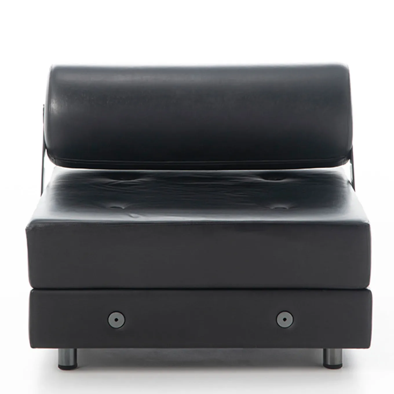 Equipped with a rotating and completely reversible backrest, this cutting-edge lounge chair exudes a distinct modern personality. Initially designed for the Louvre to allow visitors the chance to view the art hanging on its walls from all sides, it suits waiting lounges, hospitality contexts, as well as sophisticated home settings. Its wooden and metal frame padded with polyurethane foam is wrapped in prized, black-hued leather to ensure unrivaled comfort, leaving exposed only a few elements in gunmetal gray.