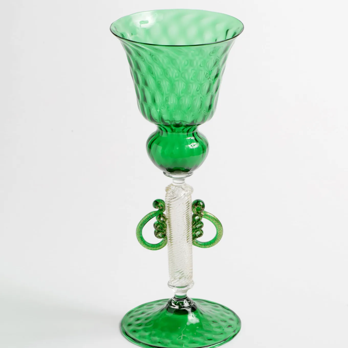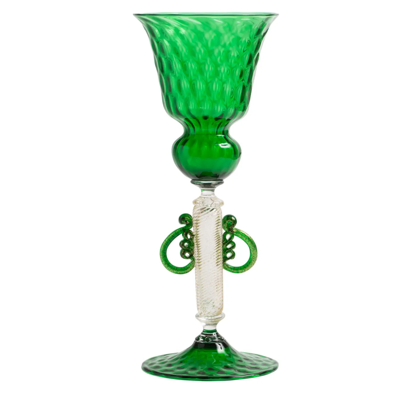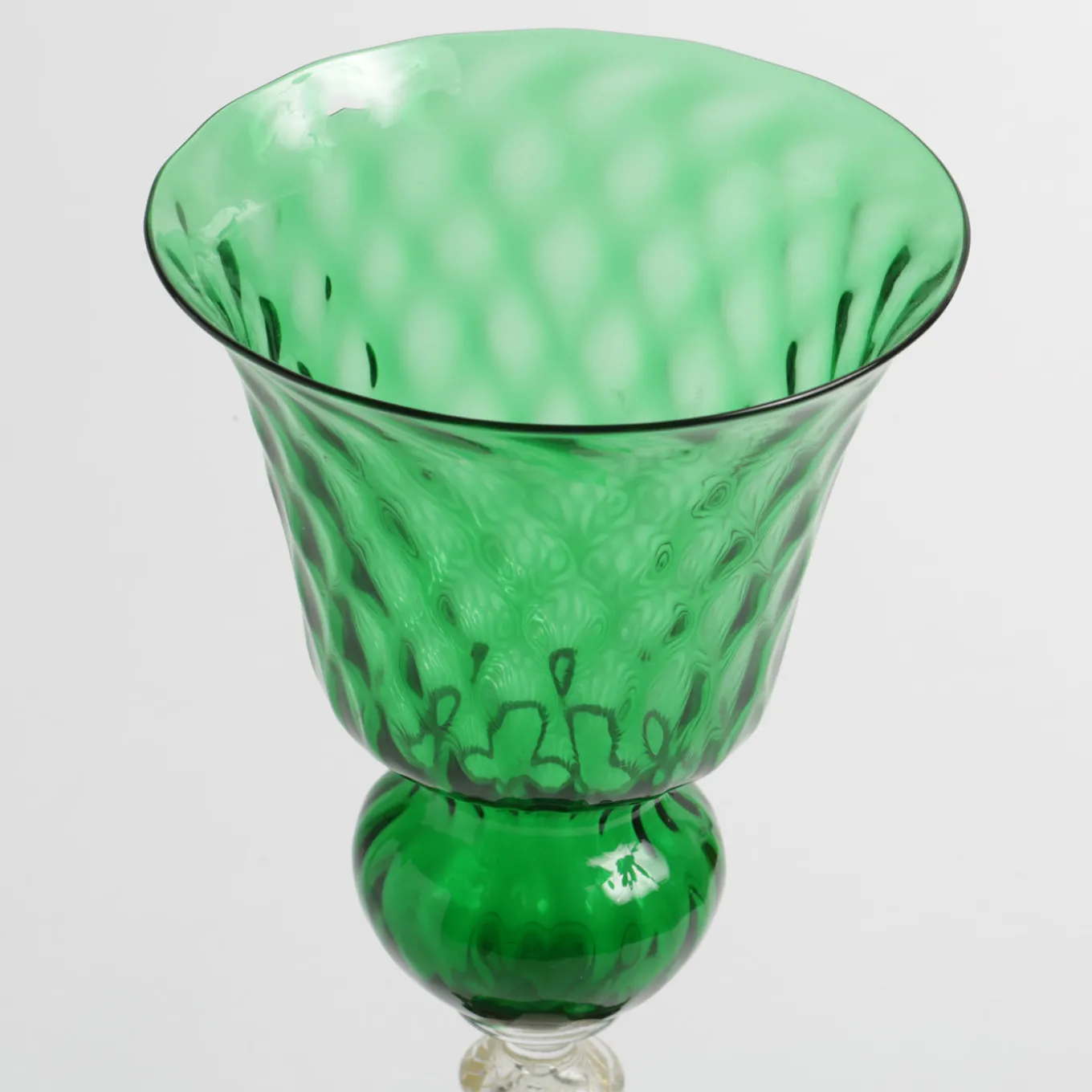 This striking glass gets its name from the “balloton” technique that creates the typical raised criss-cross pattern of the body and base in vivd green color. This decoration is obtained by blowing the glass shape into a specific bronze cast. The crystal colored stem is elegantly decorated with exquisite glass curls in green.