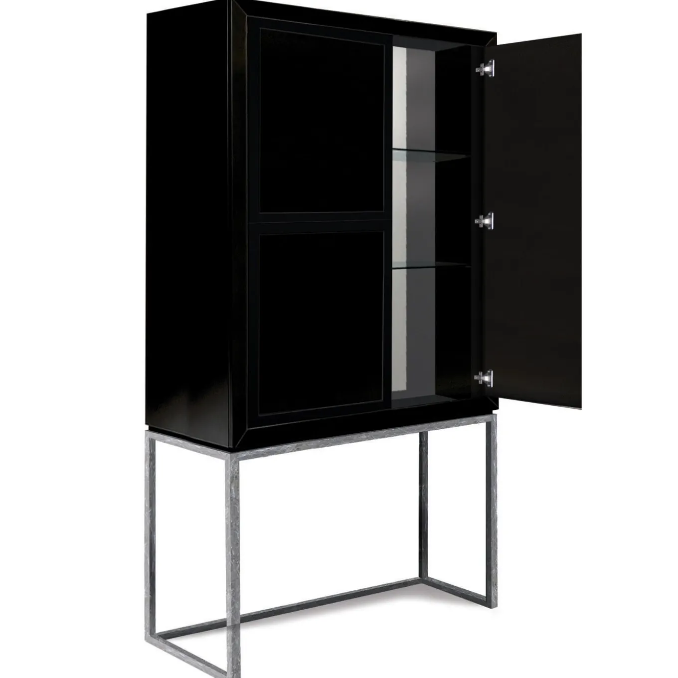 This two-door drink cabinet beautifully crafted by the finest Italian artisans rests on a silver leaf metal frame and is finished in a hard, super sleek black gloss lacquer. The mirrored finished wooden handle has a delicate, modern elegance. Ideal for storing bottles and glassware, the cabinet features two glass shelves and mirrored backing. Designer: Isabella Costantini.