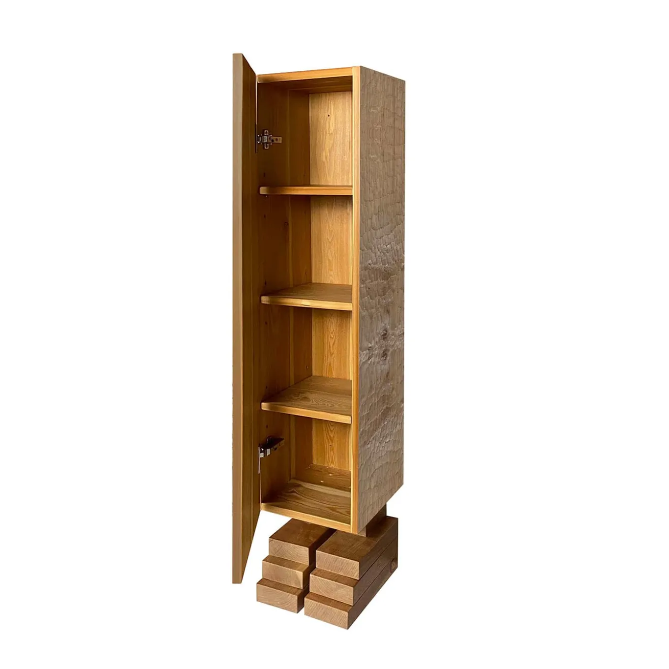 This one-of-a-kind cabinet designed by Pietro Meccani is a gem of artisan woodworking of exceptional sculptural impact. Inspired by Indigenous totems, its towering structure combines European larch and maple for the storage unit, while cherry is featured in the two stepped feet. The outstanding trait is the minutely carved door, which opens to reveal two practical inner shelves.