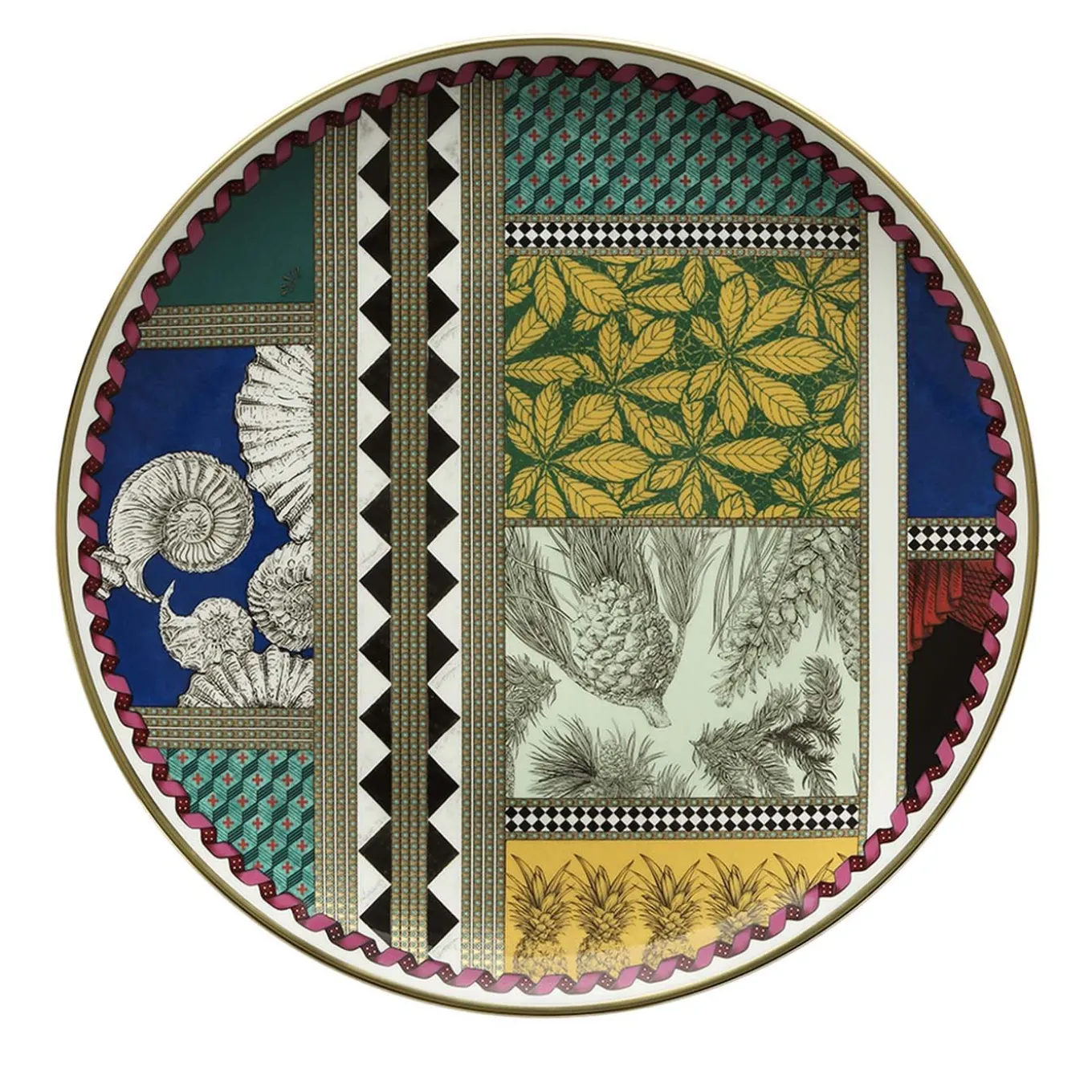 A sublime piece of functional decor that boasts an eclectic and modern allure, this round plate can function as a vide poche or small decorative piece to accompany the other items in the striking Totem Collection. This series of visually stunning pieces are crafted of porcelain and evokes a trend of 18th century home decor that used vivid colors and nature-inspired subjects to adorn lavish interiors. In this case, geometric frames in black and white divide the round silhouette of the plate, enclosing colorful vignettes that depict pineapples, leaves, and shells.
