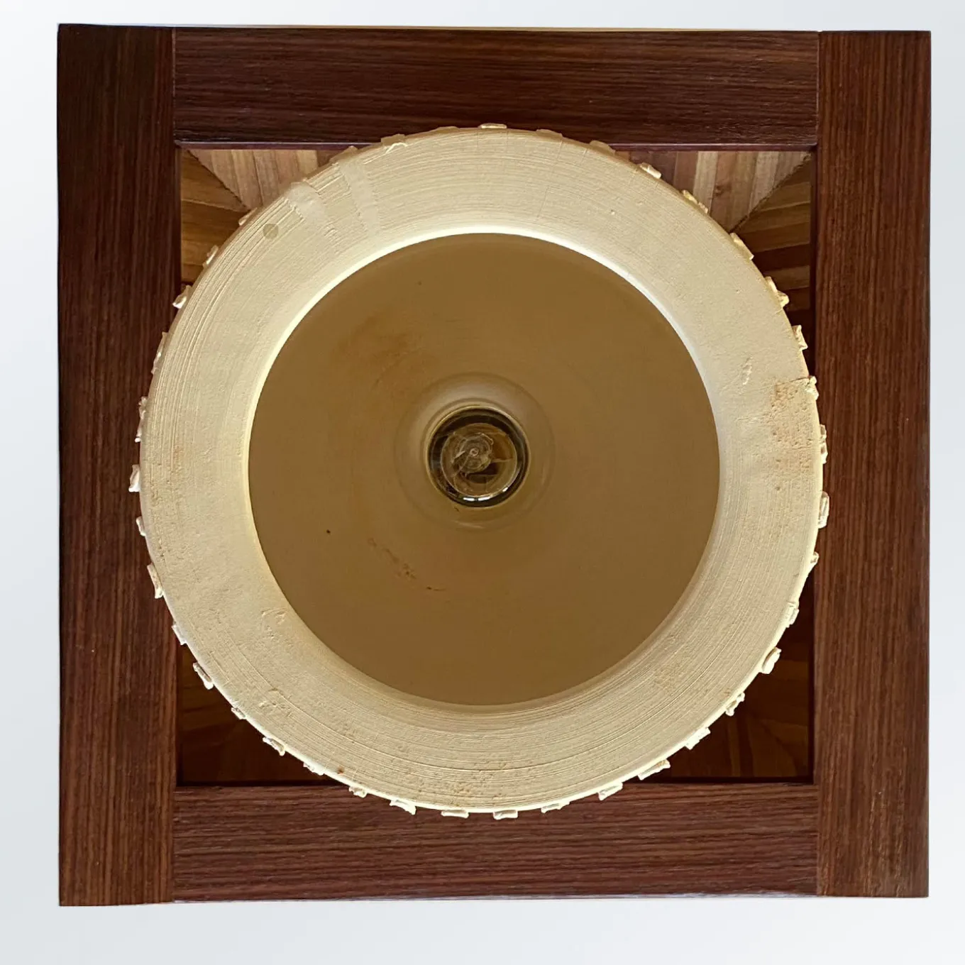 Featuring a sculptural cherry body consisting of two truncated pyramids sealed together and marked by thin grooves, this table lamp is a singular piece entirely handcrafted, numbered, and signed by the artist. The topping shade in off-white ceramic flaunts an elegant ridged design, tempered by the smoothness of its supporting stem combining two piled, cylindrical volumes in solid cherry.