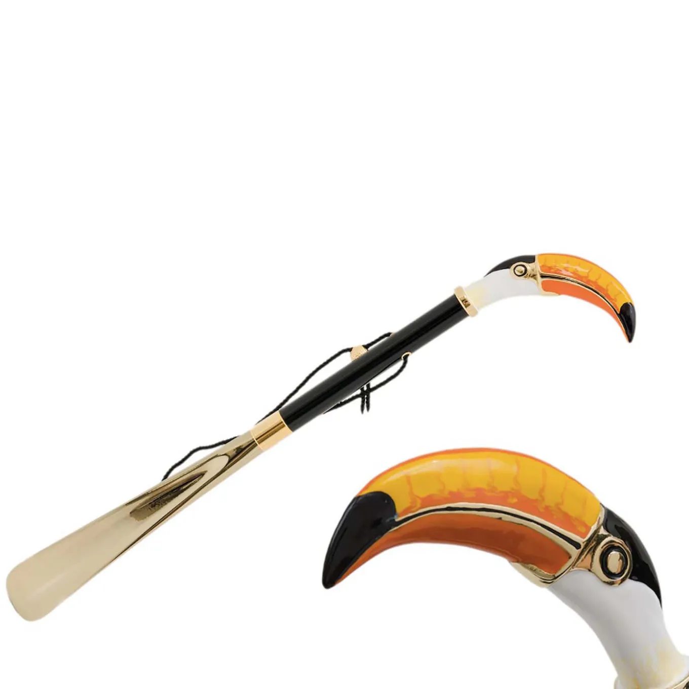 Stylish, with a tropical flavor describes the Toucan Shoehorn handcrafted in Italy and featuring a brightly colored enameled brass handle in the form of a toucan head and beak. The shaft is made from wood, while the horn end is in ABS. Total length: 50 cm