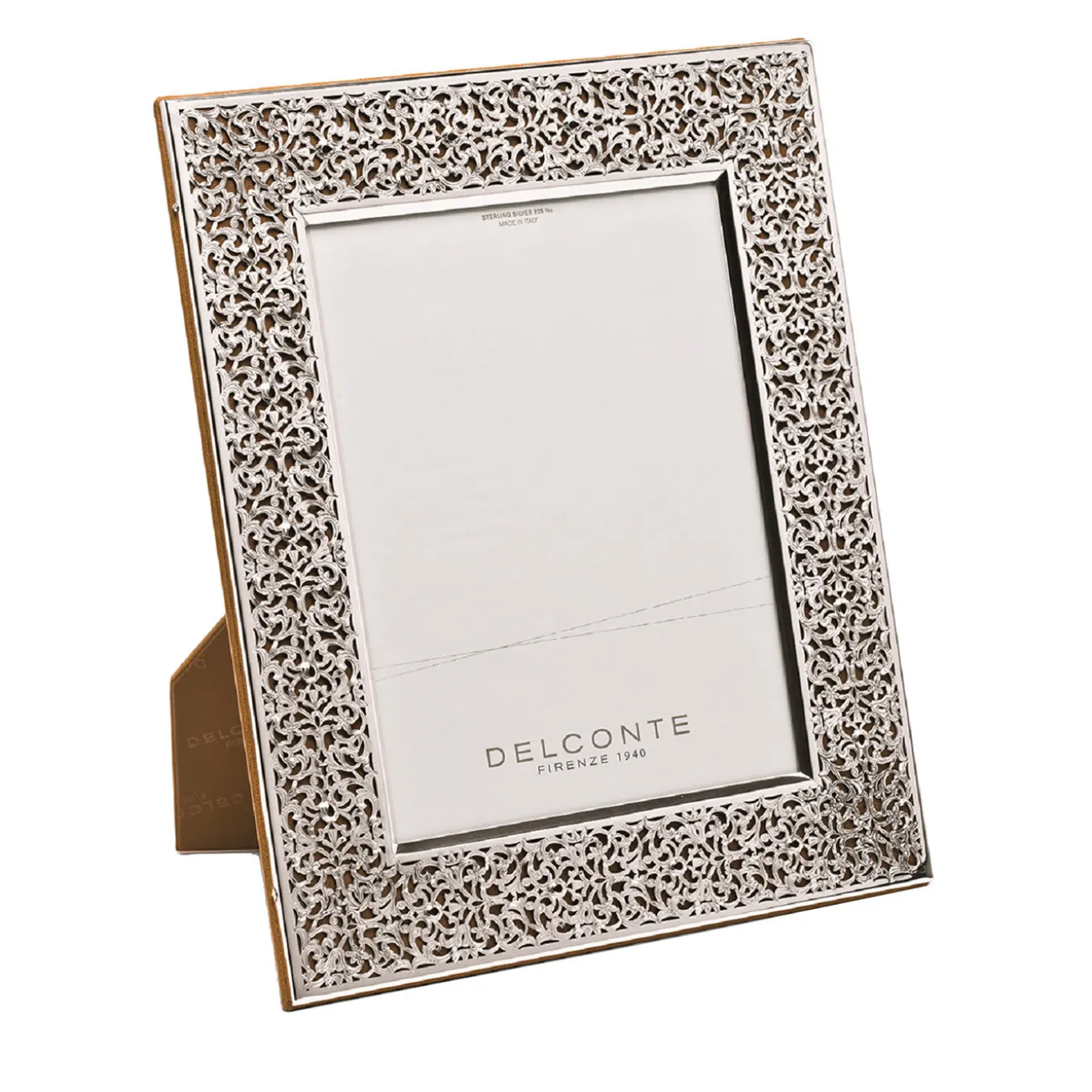 This marvelous frame in sterling silver 925 is distinguished by a dainty Baroque-inspired fretwork design, revealing the natural leather covering the back through its intricate dance of flowers and branches. Elegantly sitting on accent tables or consoles, it will splendidly host 18x24cm photos within the 5cm-wide sides. Other size variants are available, please contact the Concierge for detailed options and pricing.