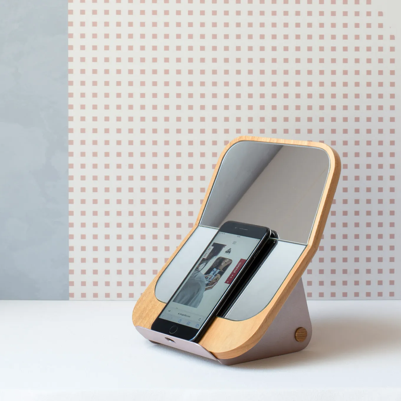 An innovative and singular design by FrattiniFrilli, this mobile device support combines art and functionality in a single sleek item. Simple and easy to handle, it is handmade of solid wood and features a laminate base. The mirrored surface makes it a multi-functional item that can also work as a vanity mirror.