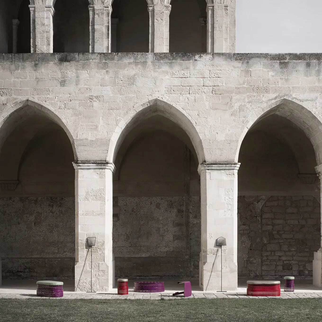 An exquisite piece of charming contemporary allure, this oval pouf is named after the skillful laser-cut work that defines the base structure recalling the warp and weft of hand-woven fabric. Fashioned of red-lacquered steel, this pouf is enriched by a soft cushion padded with Dry-Fly and upholstered with removable indoor-outdoor fabric. Also suitable for indoor areas. Please consult the Concierge for customization options.