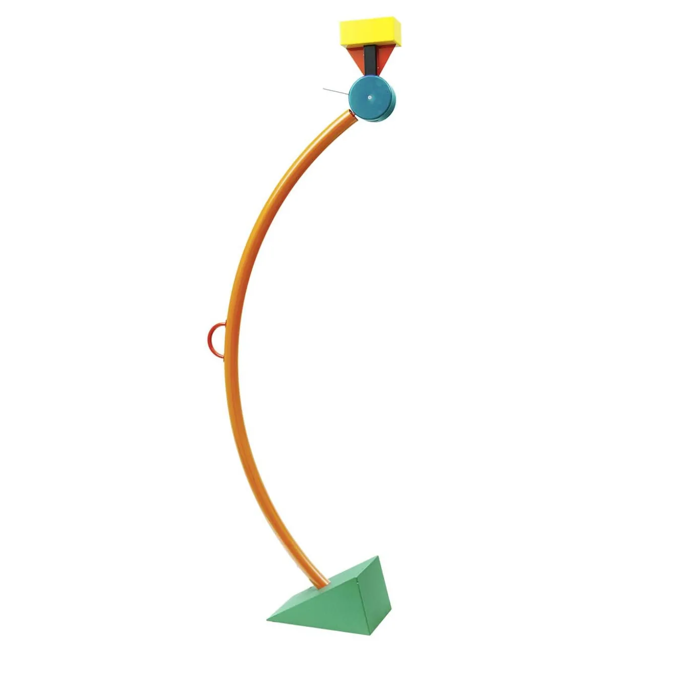 A dynamic sculptural piece that will enrich with lively allure a contemporary interior, this floor lamp will stand out in a living room, study, or bedroom, infusing a colorful flair. This piece was designed by Ettore Sottsass in 1981 and is crafted of metal with a halogen bulb on top, encased in a conical shape. The geometric elements that make up this unique design are each marked by a different vibrant color. This lamp can be equipped with a 110V system by requesting it to the Concierge before the purchase.