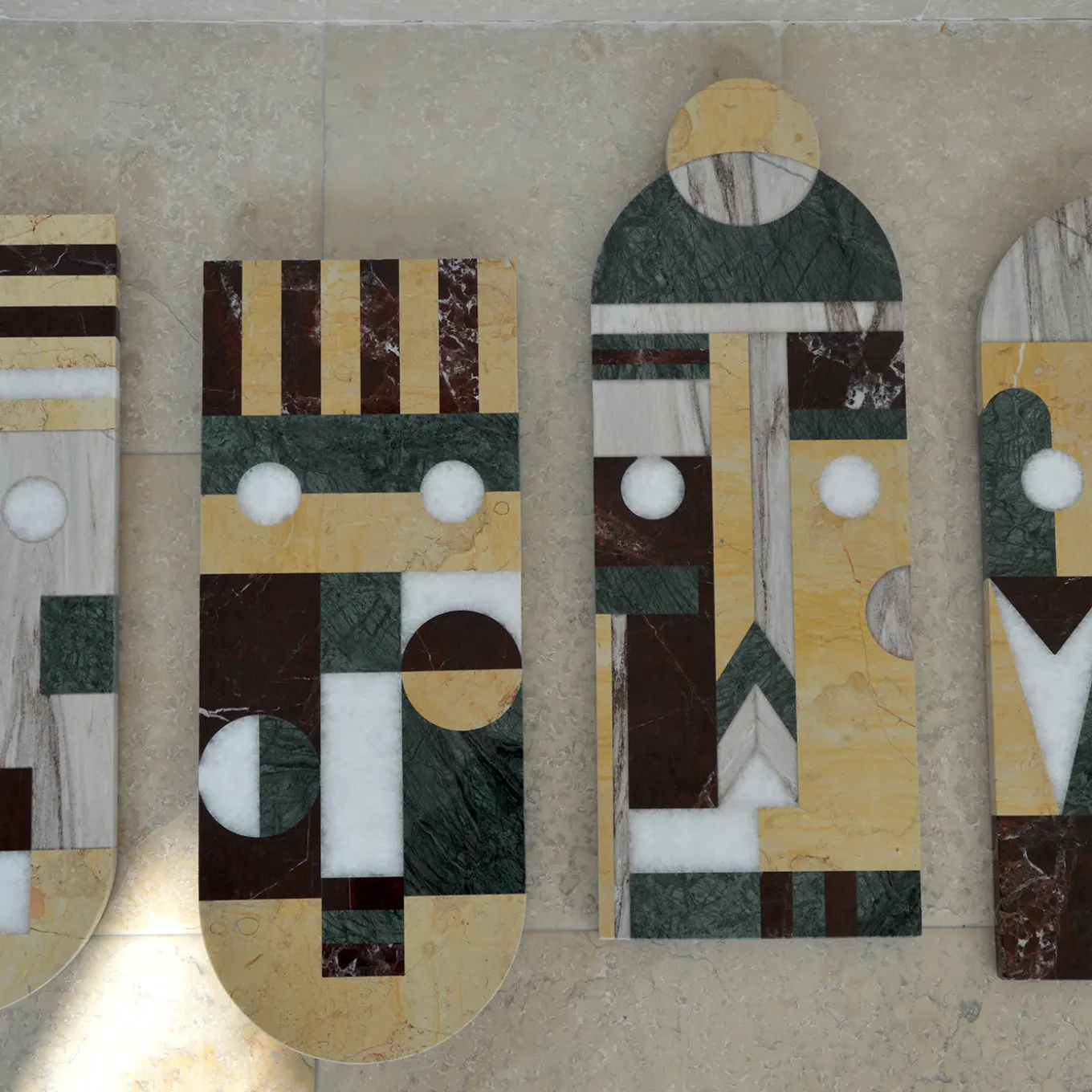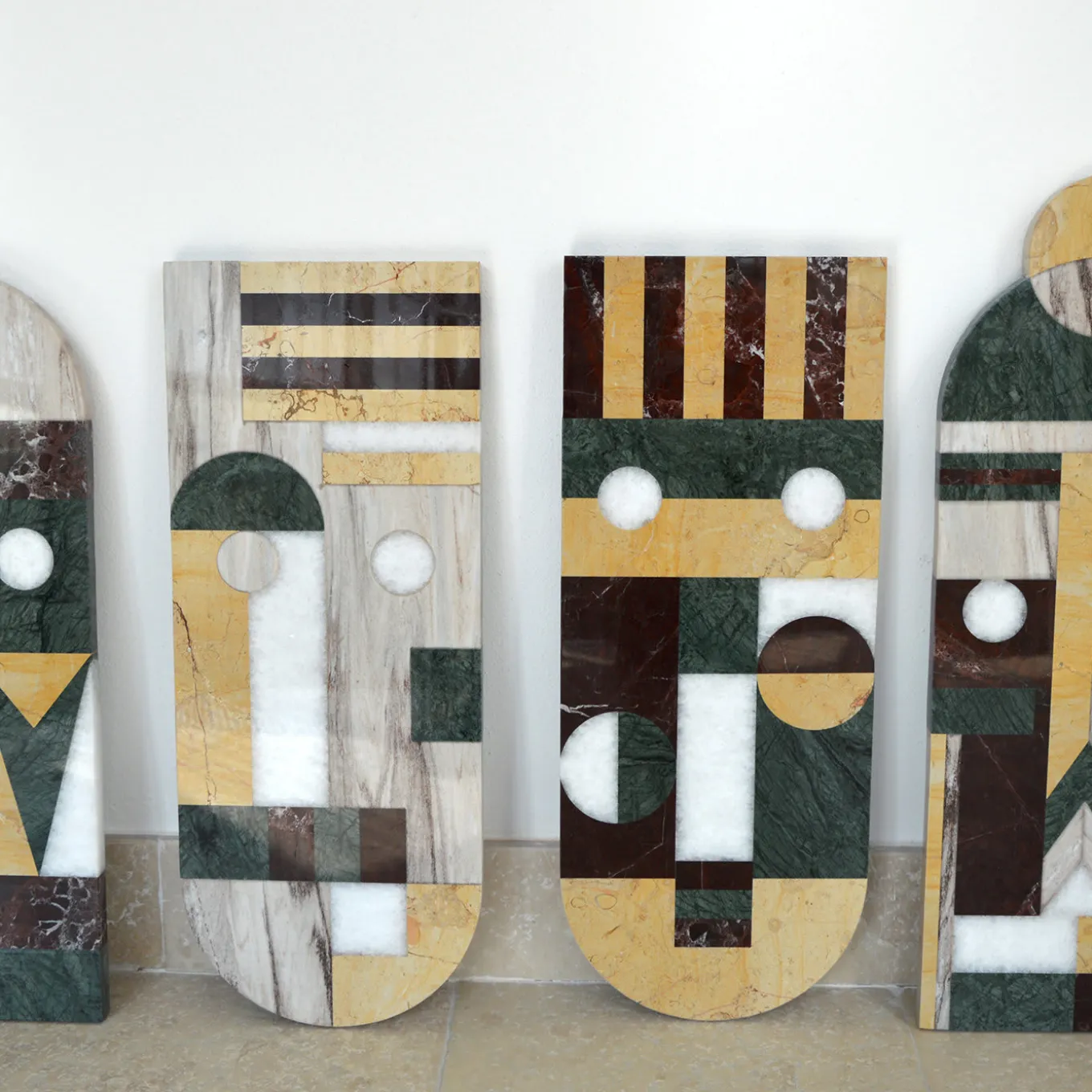This exquisite wall mask perfectly synthesizes tribal influences and modern taste with its cutting-edge design. Featuring circular light elements standing as eyes, the piece has a distinctive geometrical flair due to the juxtaposition of marble tiles in different types without grout lines, the different colors and shapes coming together to create a striking mask.