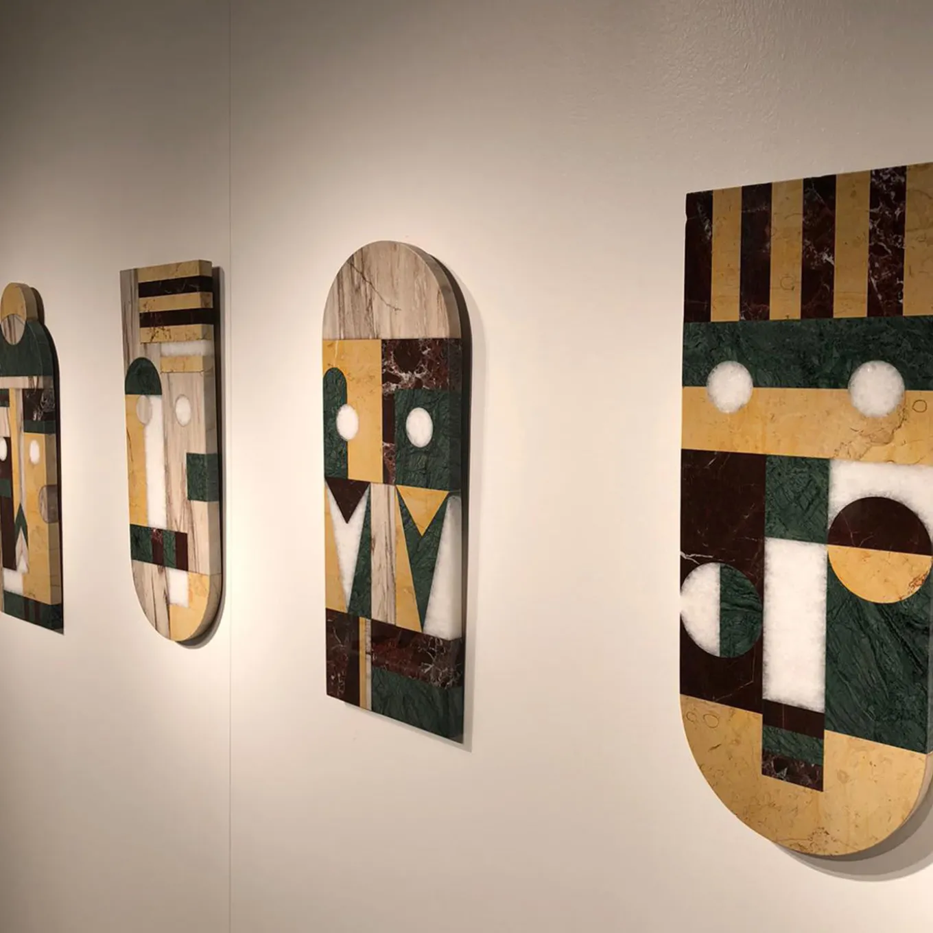Geometrical inspiration meets tribal tradition is the defining trait of this exclusive object of wall decor. The mask-like appearance is achieved through the juxtaposition of marble elements (with no grout lines) in different colors, shapes, and sizes for a final look that will lend a unique decorative twist to any wall.