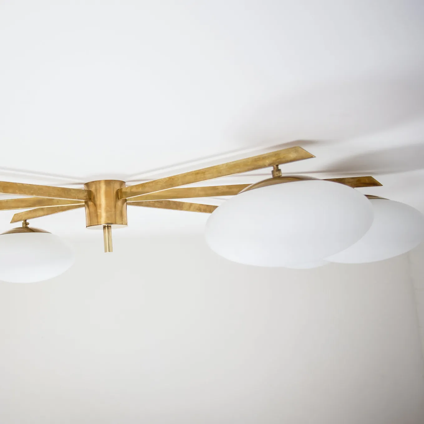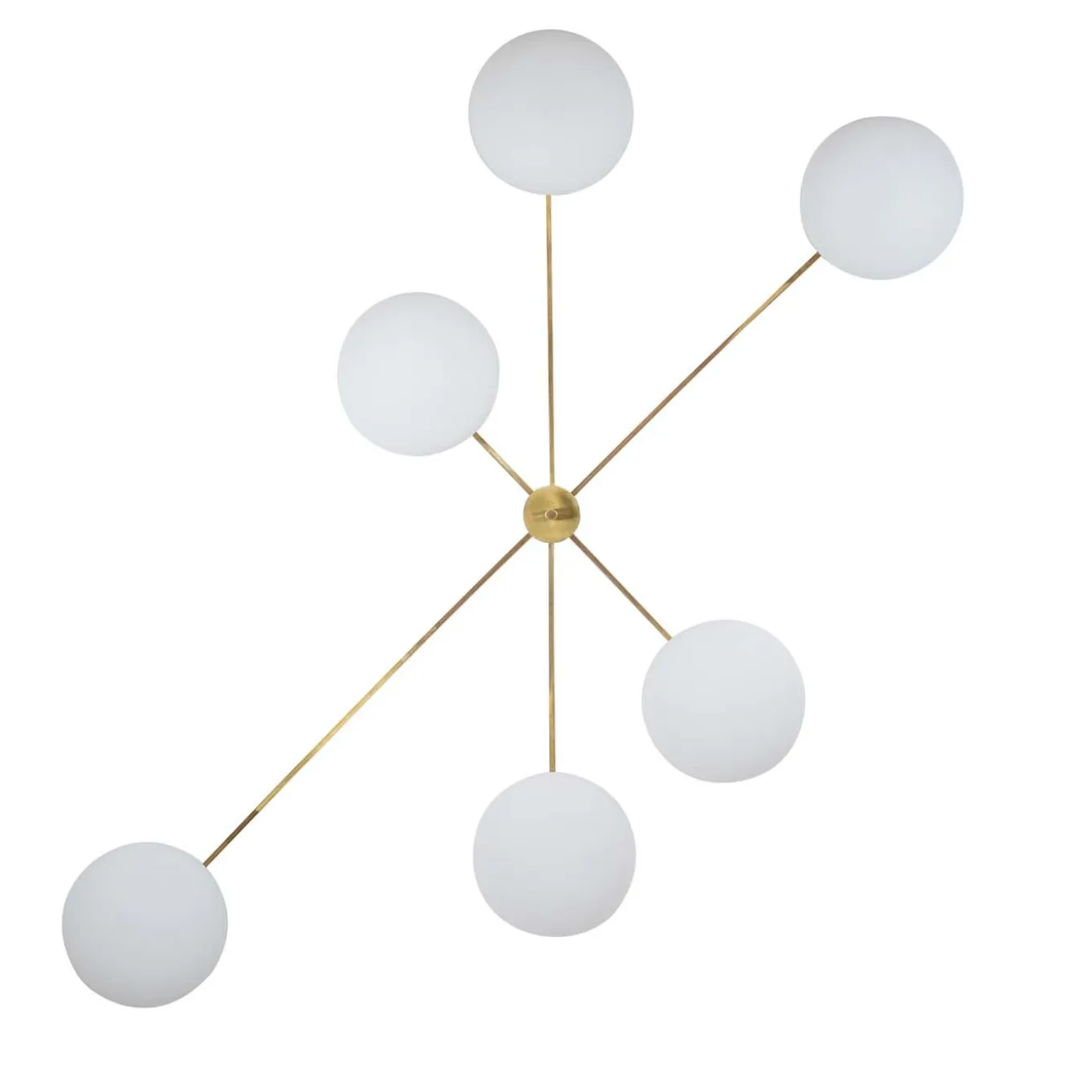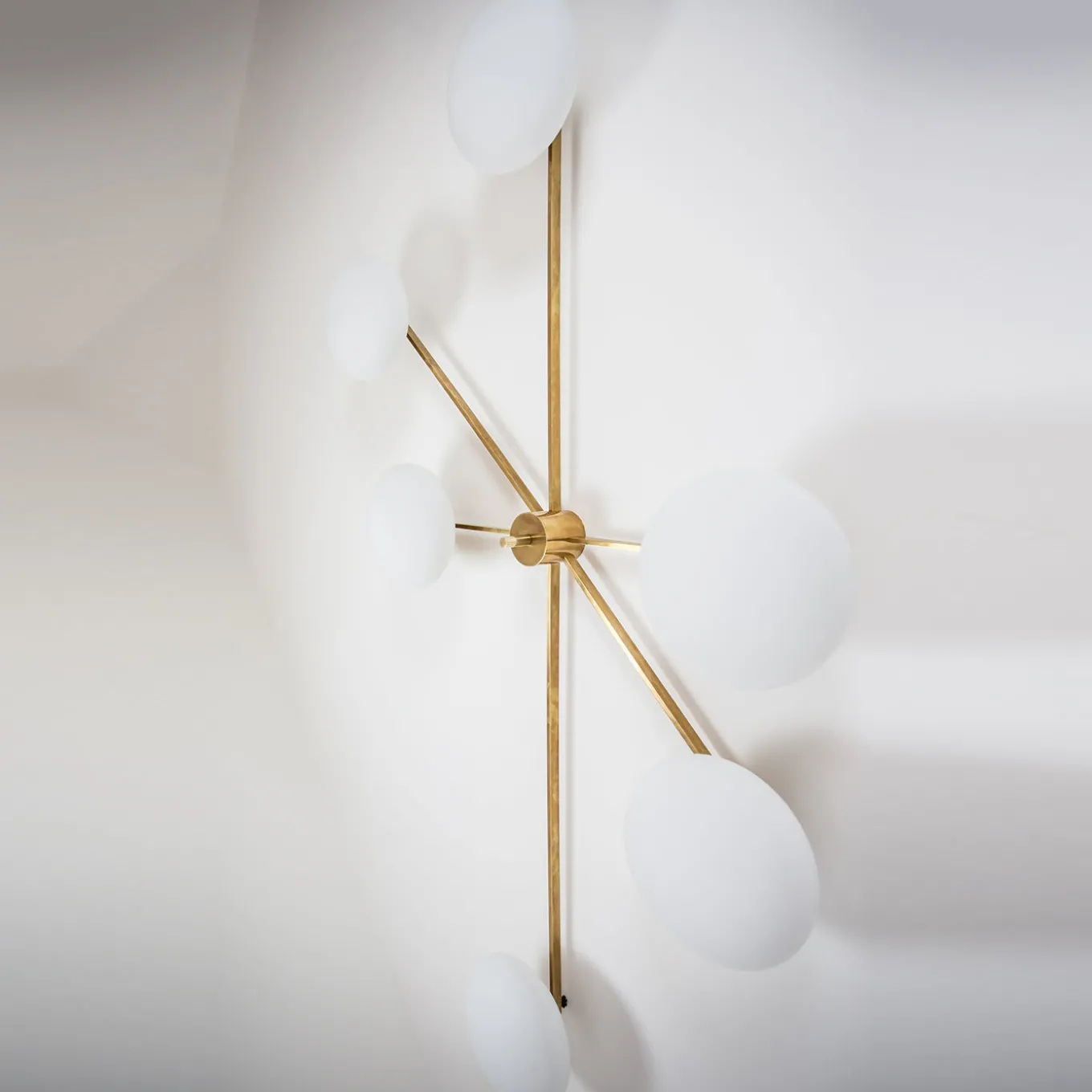 Tribute is an exclusive wall lamp characterized by an unorthodox and interesting brass shape with 6 opaline light globes at its ends. Everything is made in Italy with top-notch materials, but it can be wired both for North America and Europe. The lights are dimmable and are compatible with incandescent and LED bulbs.