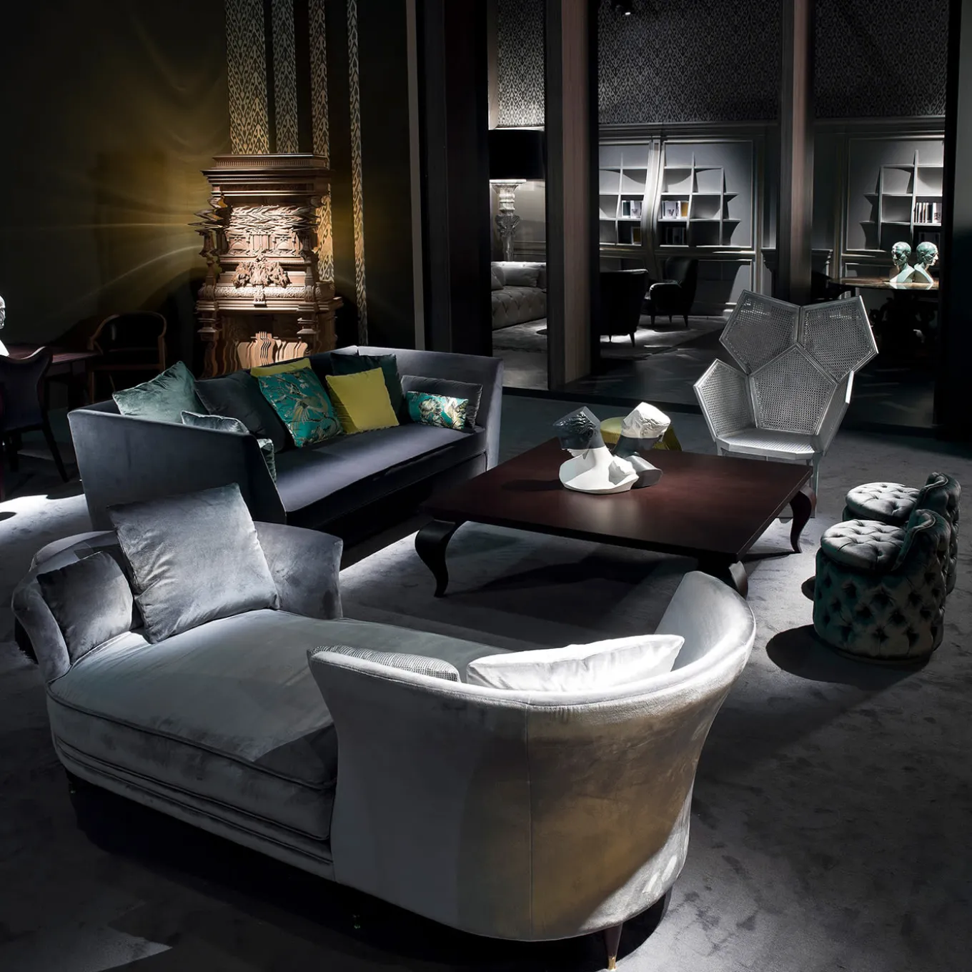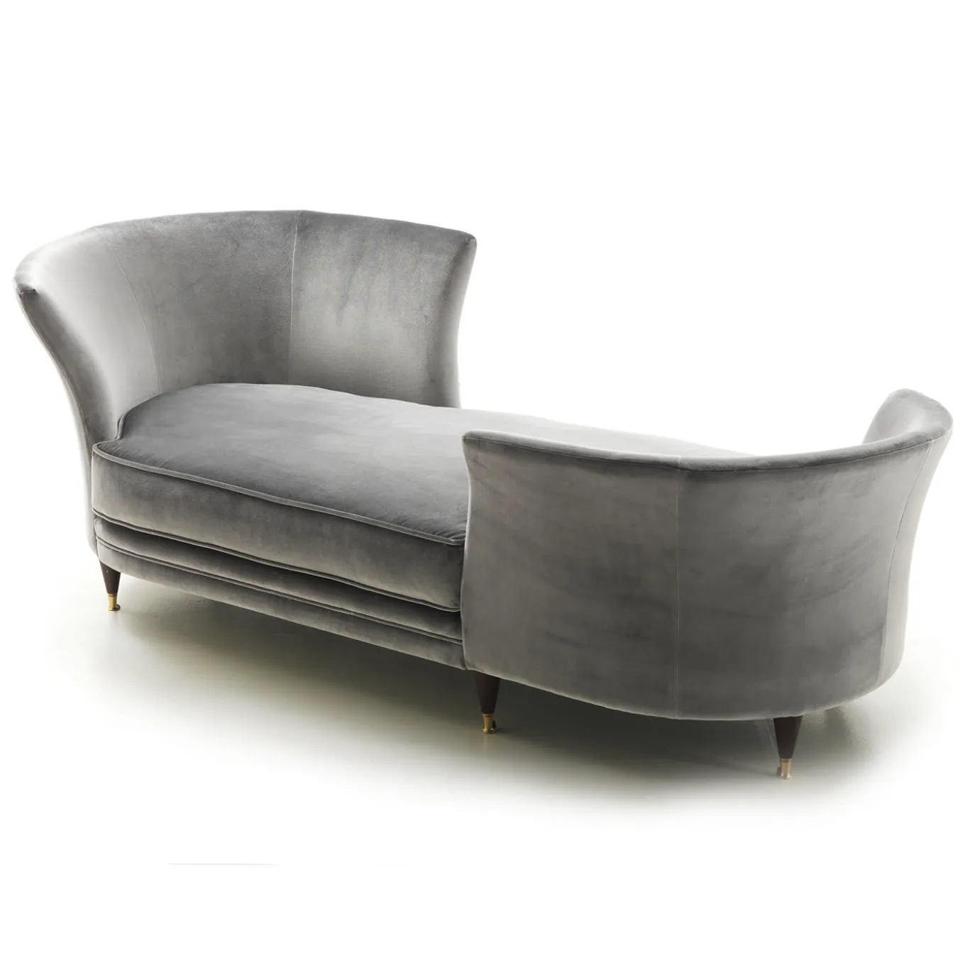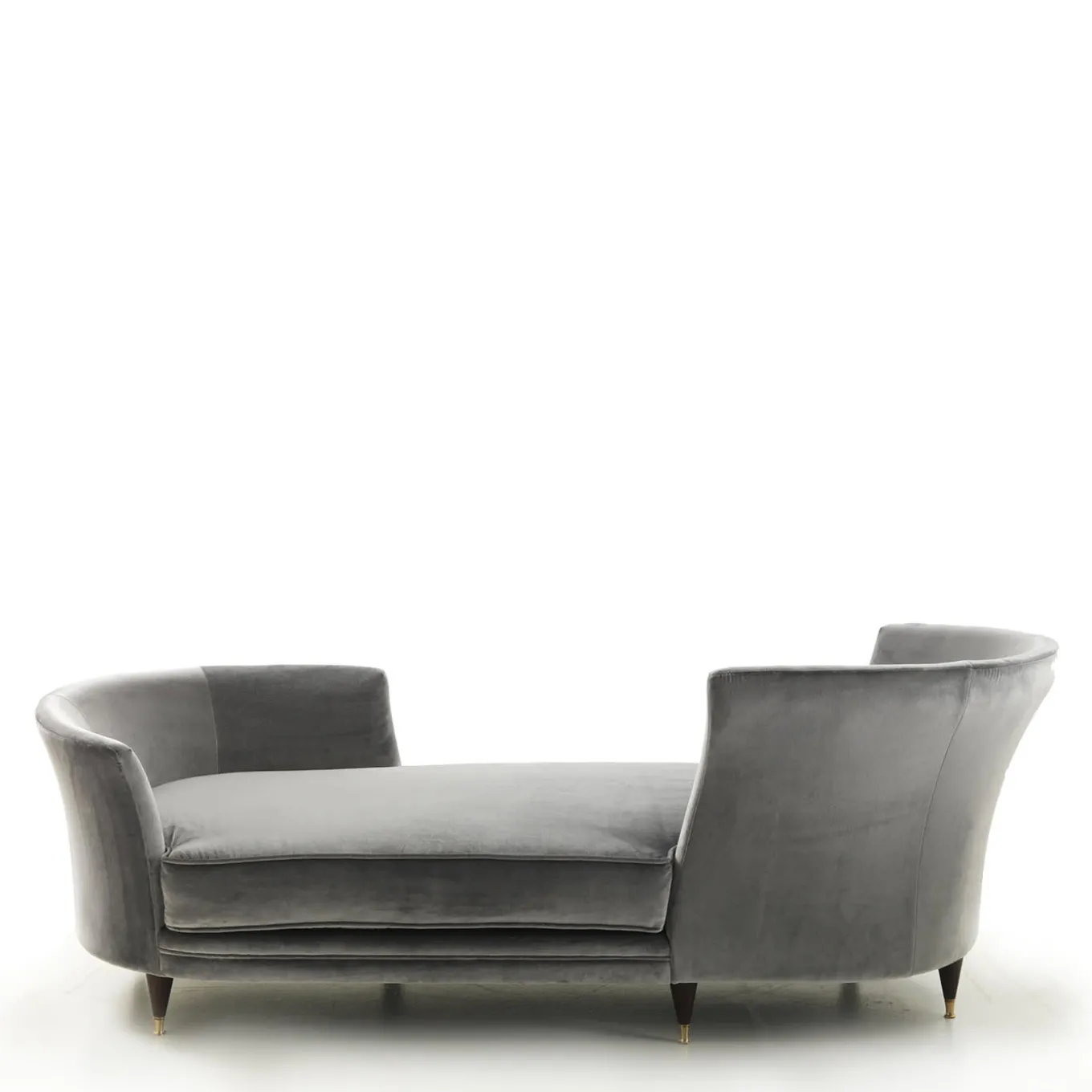 The Triclinia chaise longue alternates the sinuosity of a large sitting cushion with the straight lines that outline the two backrests, composed of two curves positioned at the opposite ends of the chaise, thus creating an intimate vis-à-vis facing position. Supporting the wooden base are thin small feet, designed to provide a slenderer shape to Triclinia thus, making it a feminine and graceful object. The finish is achieved with matte dark walnut.