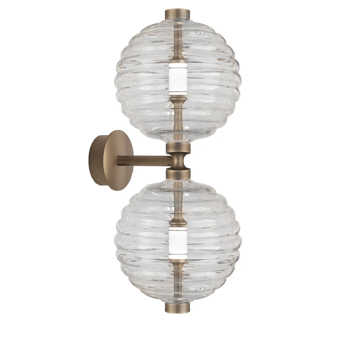 Trinity 14 wall light by Mike Shilov features two clear blown glass orbs with a distinctive horizontal striped relief, inspired by traditional Murano “rigadin” technique. The light bronze finish complements the modern design, which incorporates integrated 3W warm white LEDs at 3000°K. This wall sconce combines elegant illumination with a balanced, three-dimensional form that enhances contemporary interiors with a refined touch. Also available in satin nickel and burnished brass finishes. Bulbs are included.