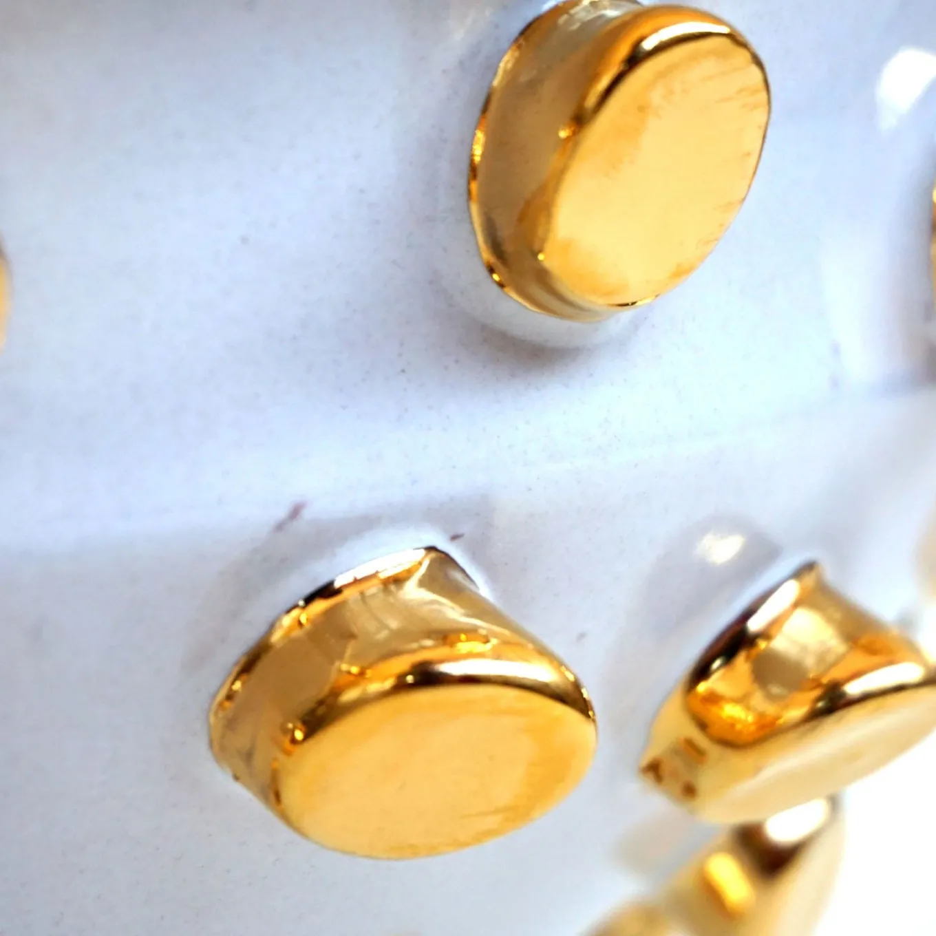 Glamorous and eccentric, this luminous centerpiece bowl in fine white ceramic makes for a spot-on solution for complementing contemporary table settings. Accented in gold, lipstick-like protuberances extend from the glossy white exterior for a daring aesthetic simply demanding attention while suggesting the piece’s luxurious feel.