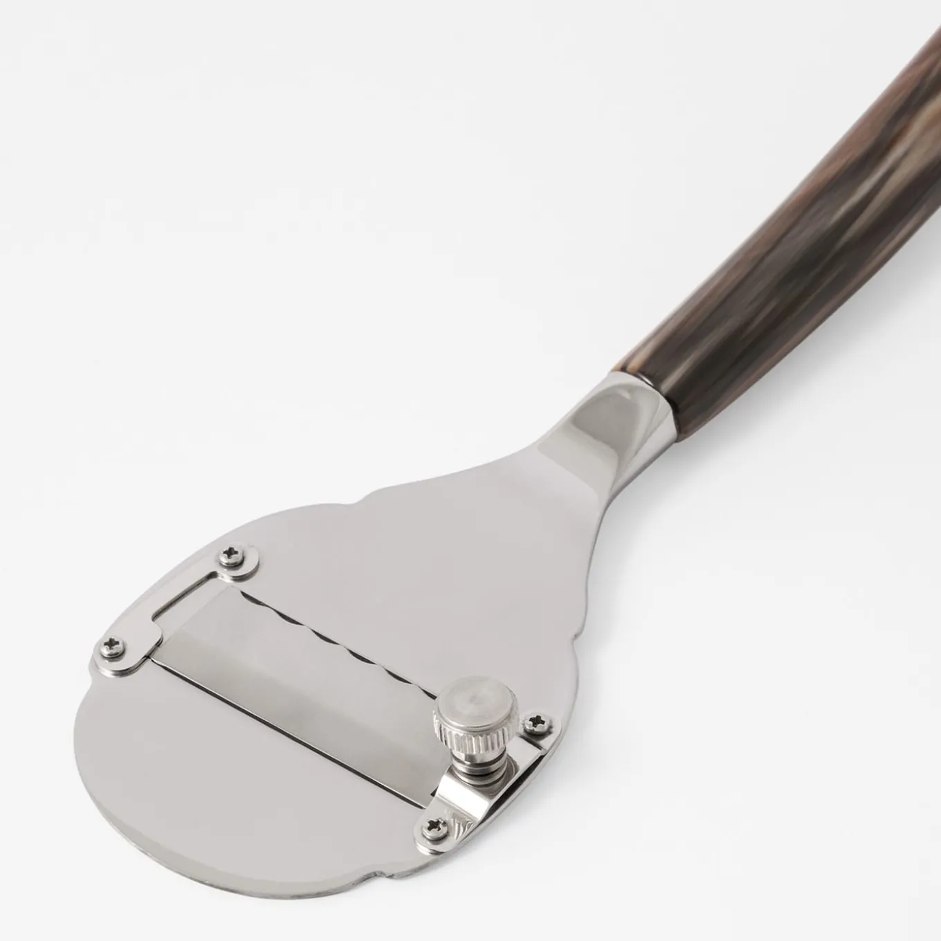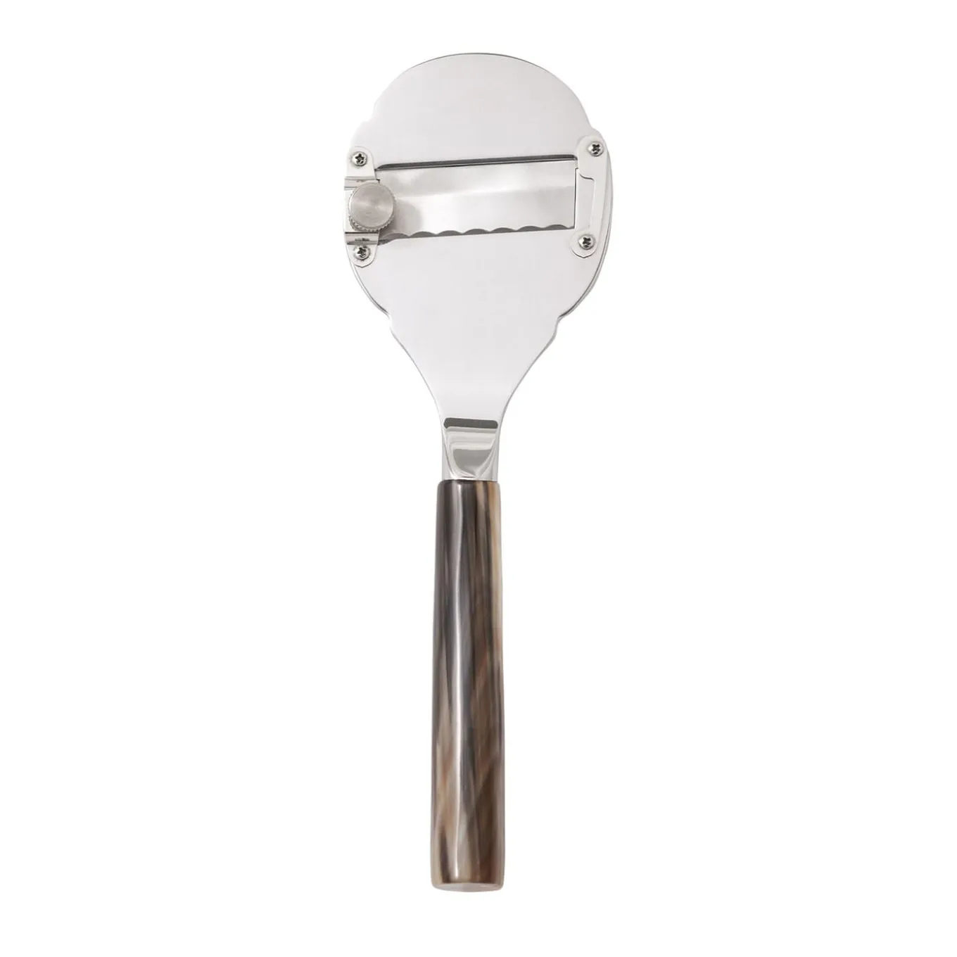This horn-handled truffle slicer is perfect for special occasions and feasts in the company of great company and wine. Expertly handmade of 18/10 stainless steel and veined blonde natural horn, the sleek design highlights the beautiful, distinctive qualities of the horn, from its gradients to its gentle curve, and precise slicer mechanism. Delivered in a handmade box with a padded, satin-lined interior, perfect for safekeeping. Part of the Classic Collection.