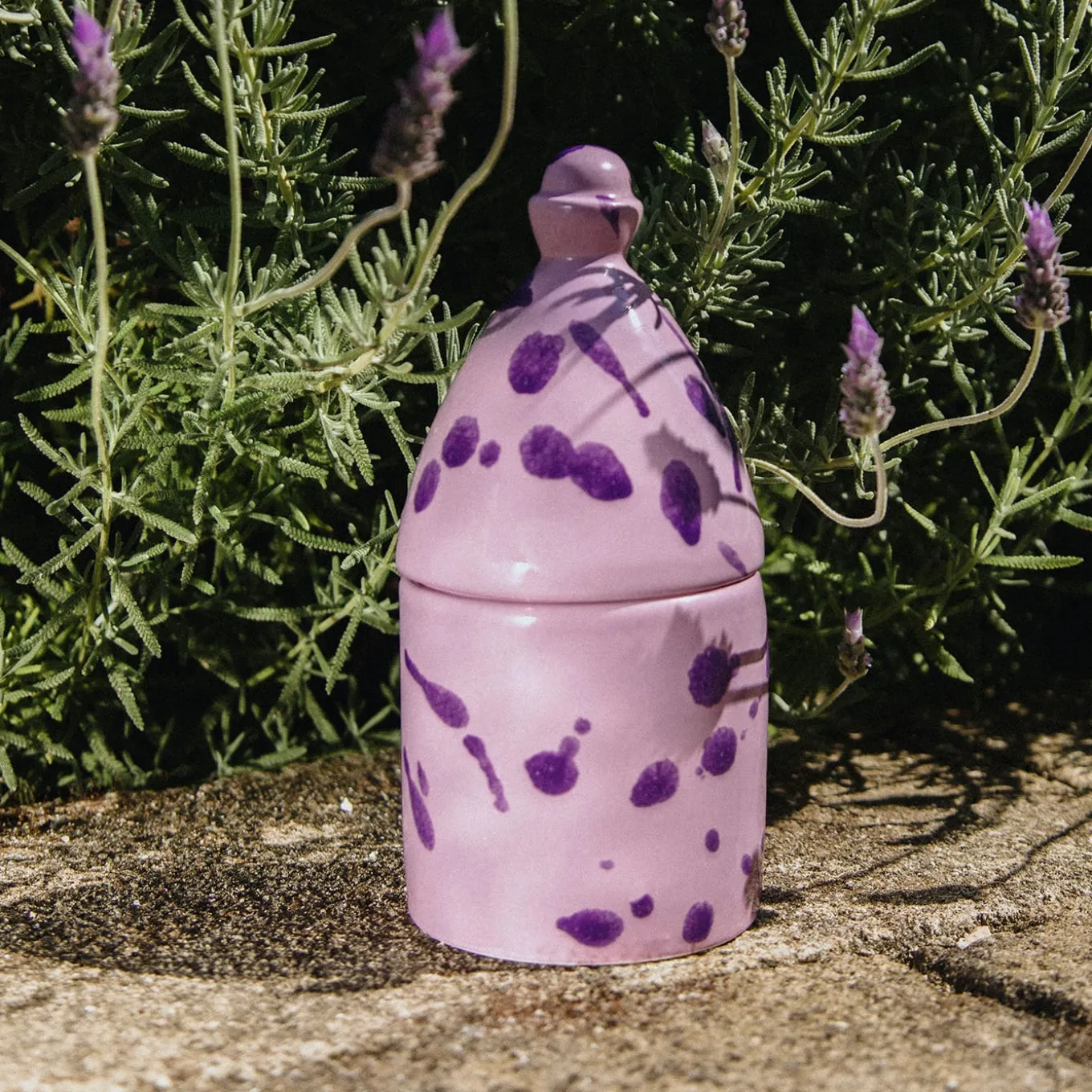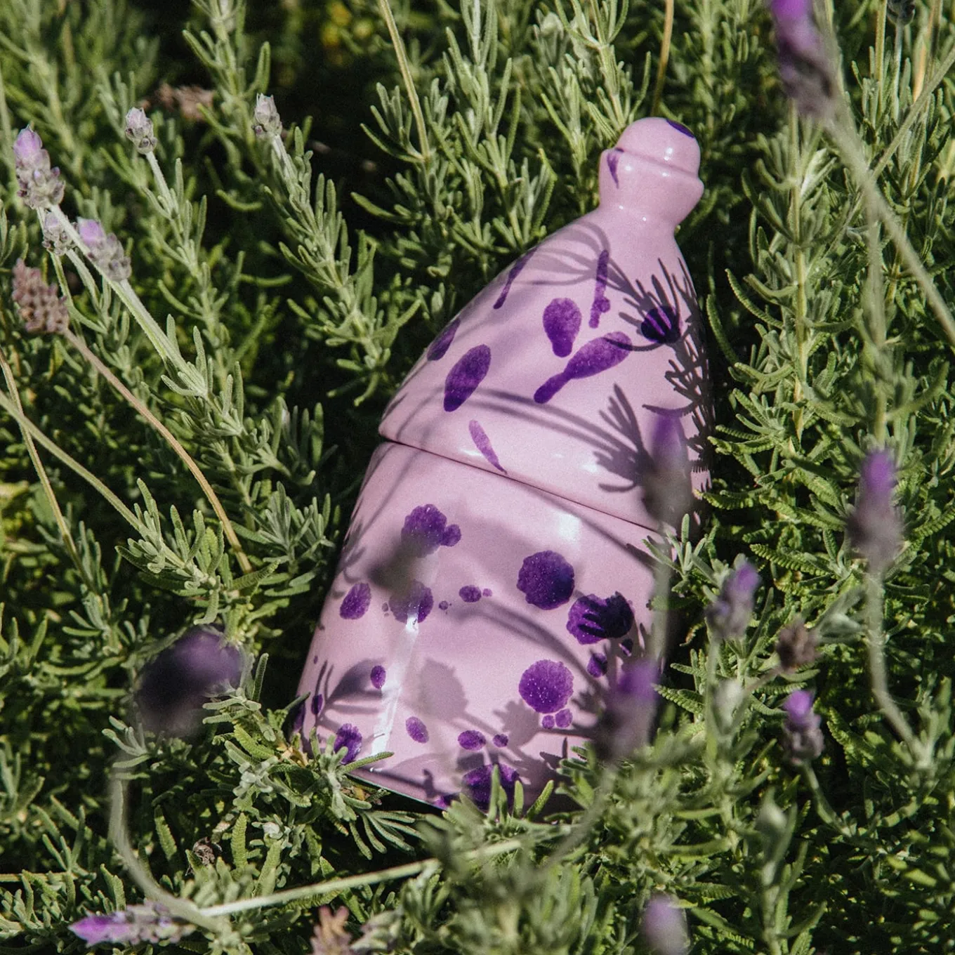 A magnificent tribute to the Itria Valley the southern region of Apulia, this candle holder features an elegant yet simple design inspired by the distinctive shape of a trullo, a typical local house. Handmade of lilac and purple painted ceramic, it is completed with a handmade soy wax candle boasting a lavender and iris scent combining warming and enveloping qualities. Available in other colors, this piece comes in recycled cardboard and a rough linen box.