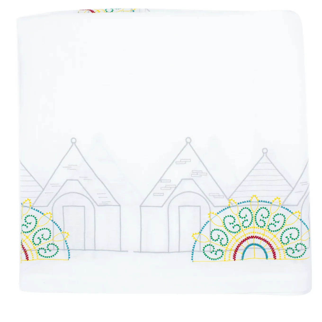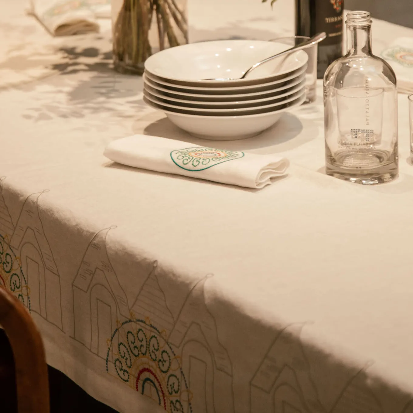 Trullos, typical Apulian homes among UNESCO’s World Heritage List, and striking light fixtures, “luminarie” in Italian, traditionally set up during Apulian village festivals make up the decoration minutely embroidered by hand on this tablecloth. Crafted using prized Mako cotton against the bright-white Masters of Linen-certified linen, they take multiple hours of patient manual work.
