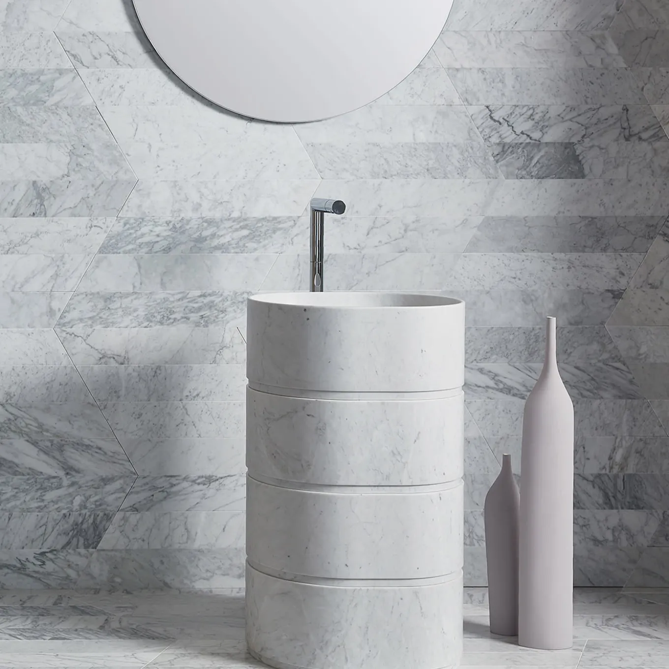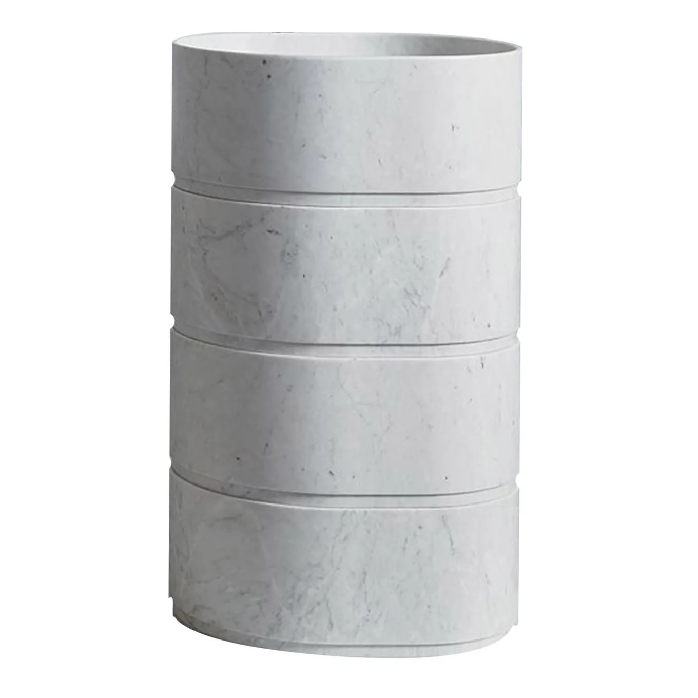Trullo is a freestanding washbasin made with four, stacked rings of marble carved out of a single block, with a matching rain and without overflow. It is available in the oval or round variant, in White Carrara or Imperial Cream. Thanks to its refined design and its details, Trullo become the epicenter of looks in every bathroom. Please, ask the Concierge for further details.