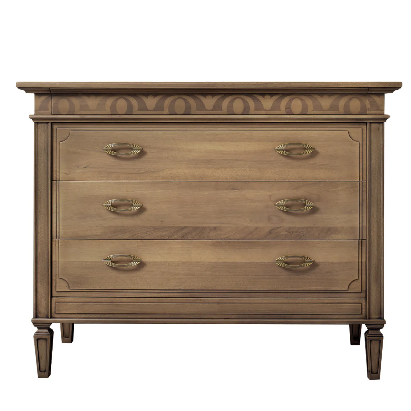This striking chest of drawers will add elegance to a classic bedroom or entryway, thanks to its traditionally designed silhouette and carved decorations. The classically inspired feet support a body with three drawers with handles and a top adorned with a geometric inlaid decoration. Fine craftsmanship and romantic allure add charm to this versatile piece made entirely of walnut.