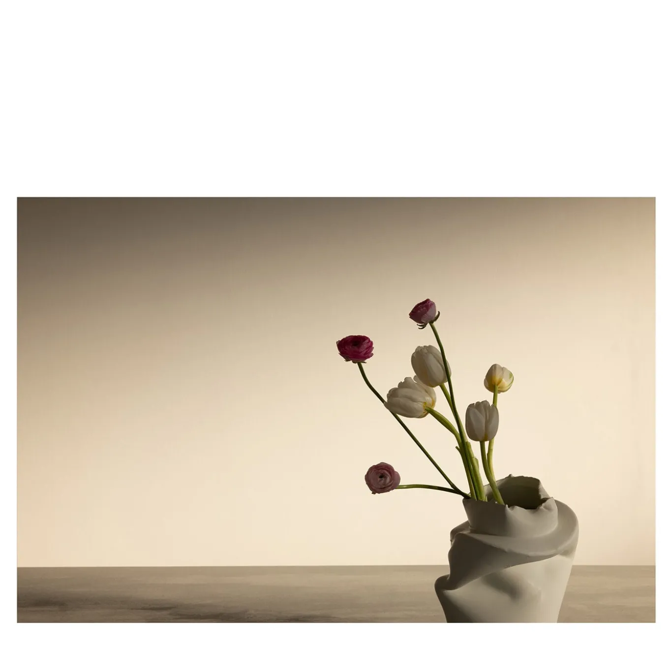 Tulips and Ranunculus in Pove is a captivating photograph that merges artistic expression with conceptual design. Printed as a pigment on fine art paper and mounted on dibond, this unframed piece is accompanied by a Certificate of Authenticity. Part of the ‘Break the Mold’ project, this work reflects the artist’s critique of mass production while honoring the ceramic heritage of Nove di Bassano, Italy. The nearly life-size print creates an immersive experience, giving the illusion that the depicted objects empty vases are emerging from the frame, evoking a sense of nostalgia and memory tied to the region’s abandoned factories. The photograph captures the essence of the artist’s ceramic designs, which are intentionally asymmetrical, reminiscent of Giorgio Morandi’s work. The vases’ unsteady forms mirror the delicate blooms they once held, embodying fragility and the transient nature of beauty.