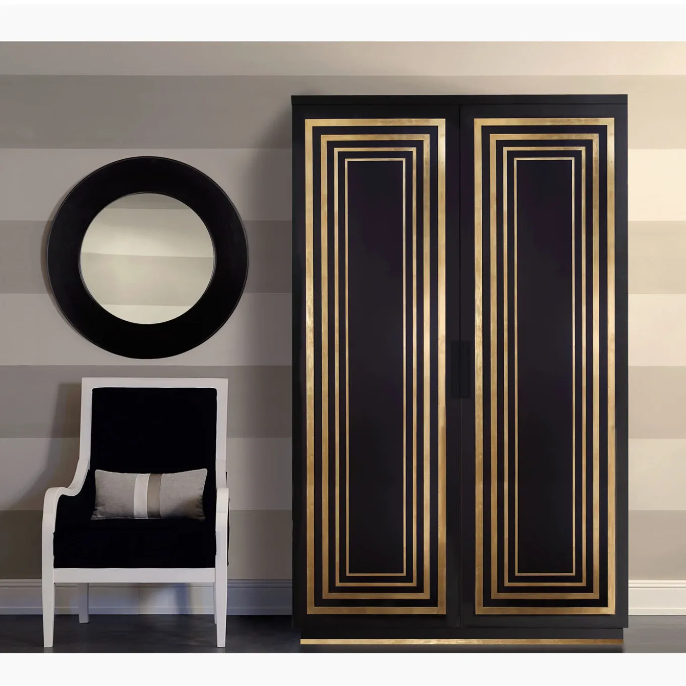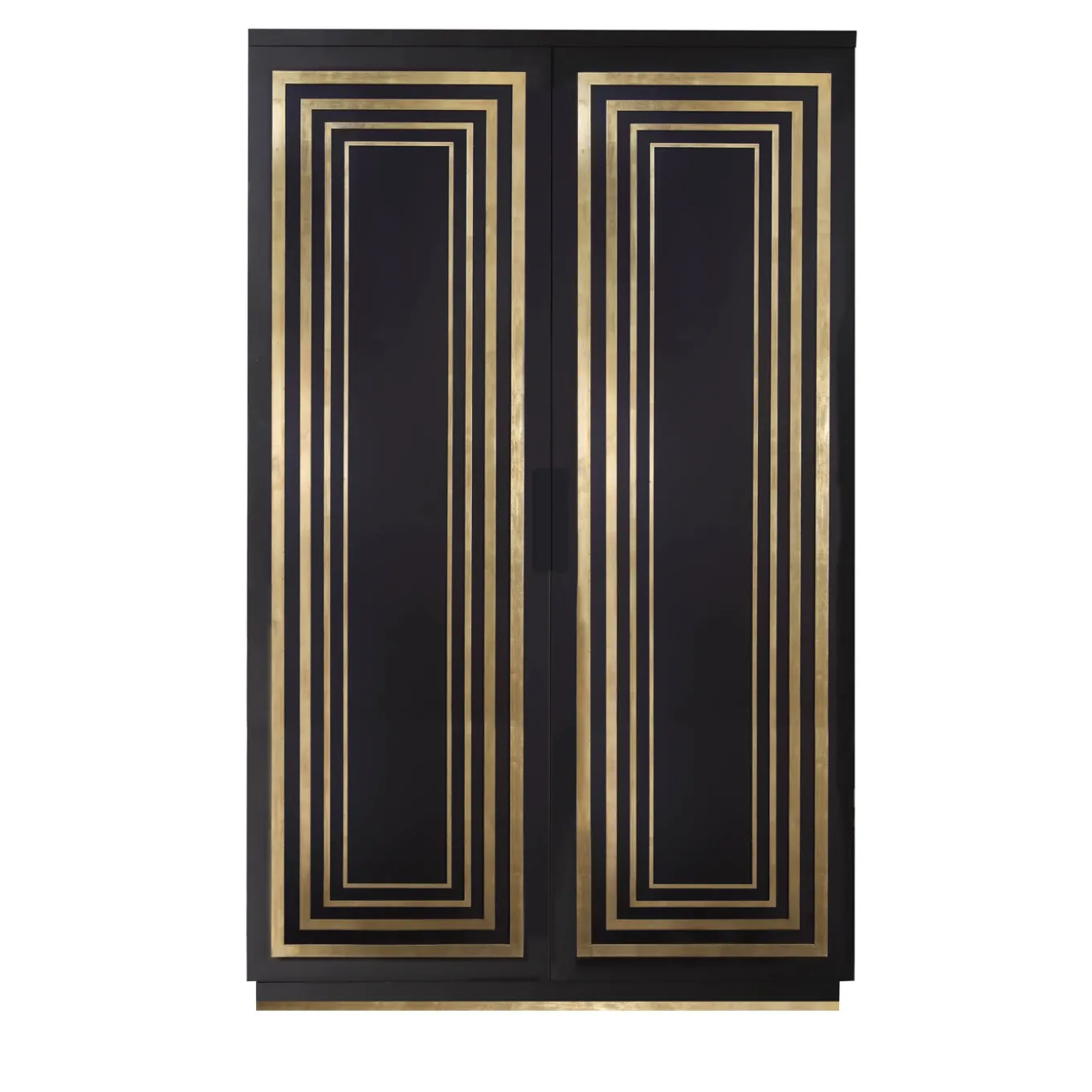 This two-door cabinet or wardrobe is the result of the finest Italian craftsmanship. Perfect for storing everything from books to dinnerware, it features four internal shelves and two doors overlaid with a hand-applied gold leaf detailing. The cabinet is available in a matt mocha lacquered finish. Designer: Isabella Costantini. Please ask the Concierge for customization options.