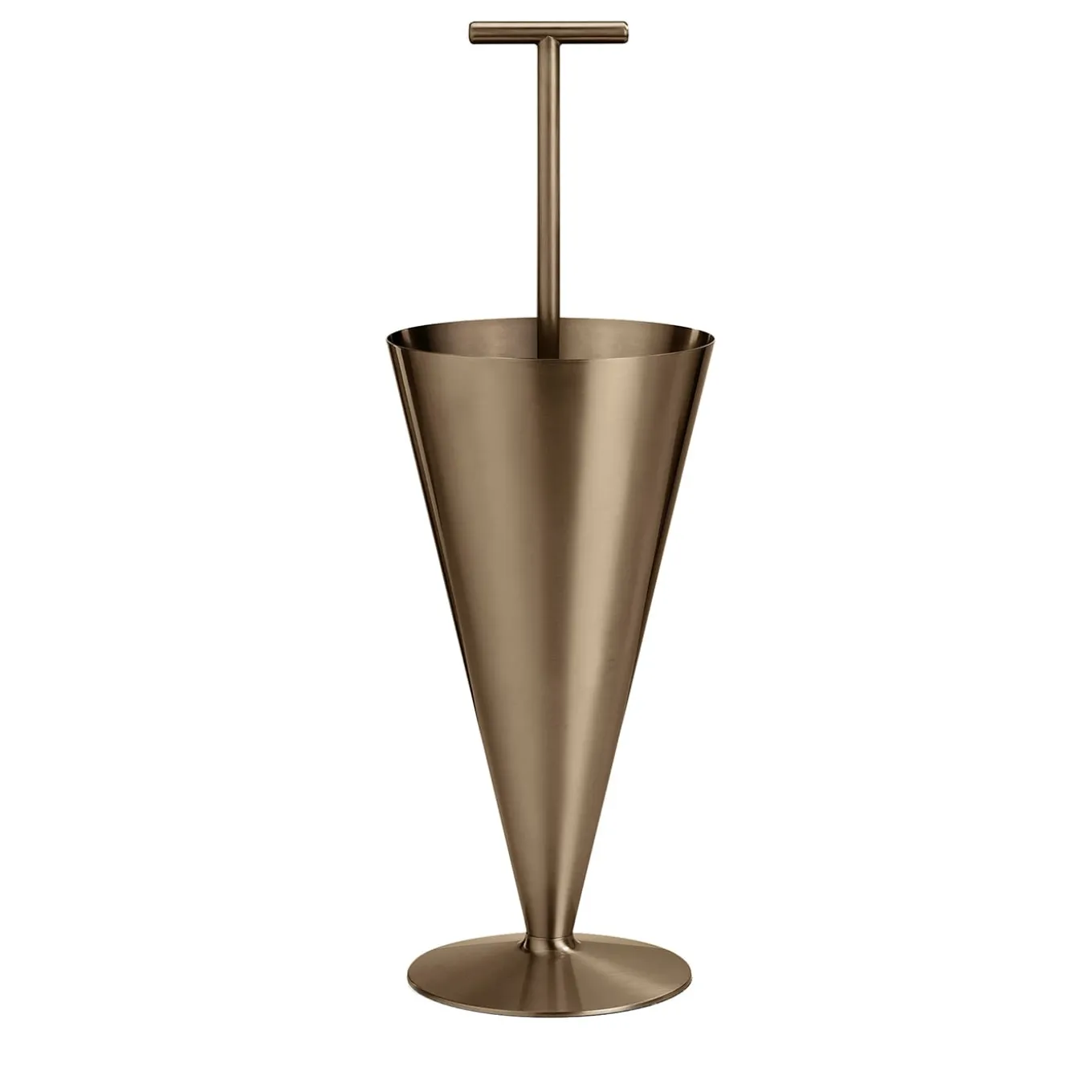 Playful and functional, this umbrella stand will fit in residential or professional contexts with equal ease. Its silhouette, completed by a round base for steady structural support, is shaped like a partially furled umbrella, the cavity traced by its canopy-like element designed to host the umbrellas in a whimsical arrangement. A central, T-shaped shaft completes this luminous design in bronze-finished brass.