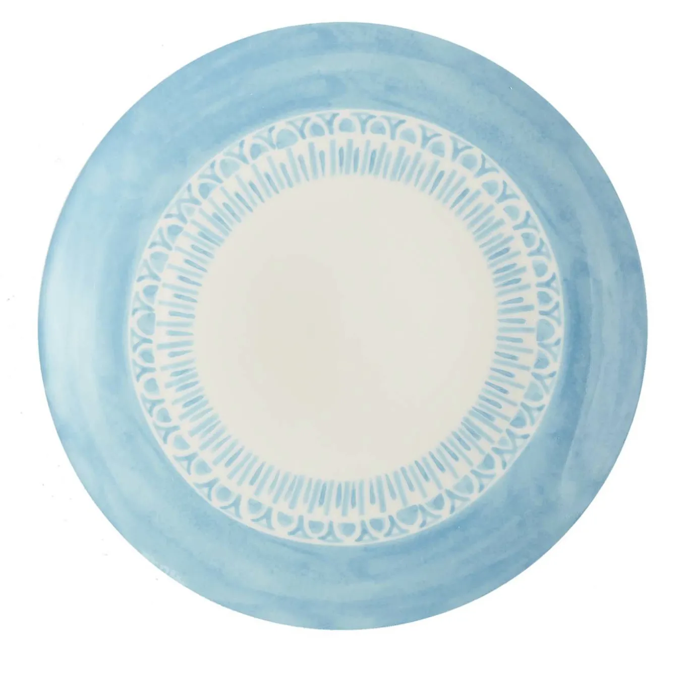 This versatile plates is an understated statement piece that will elevate the elegance of a modern tableware set. Expertly handcrafted using white porcelain, the white base boasts a stunning design reminiscent of ancient Roman fresco-decorations: a thick light-blue border lined along the interior by a delicate geometric edge in the same color, for visual depth and intrigue. Slight irregularities in design and color are signs of originality. Combined with other pieces from either the geometric or floral series, this set will make a lovely housewarming present. Measures 31 cm.