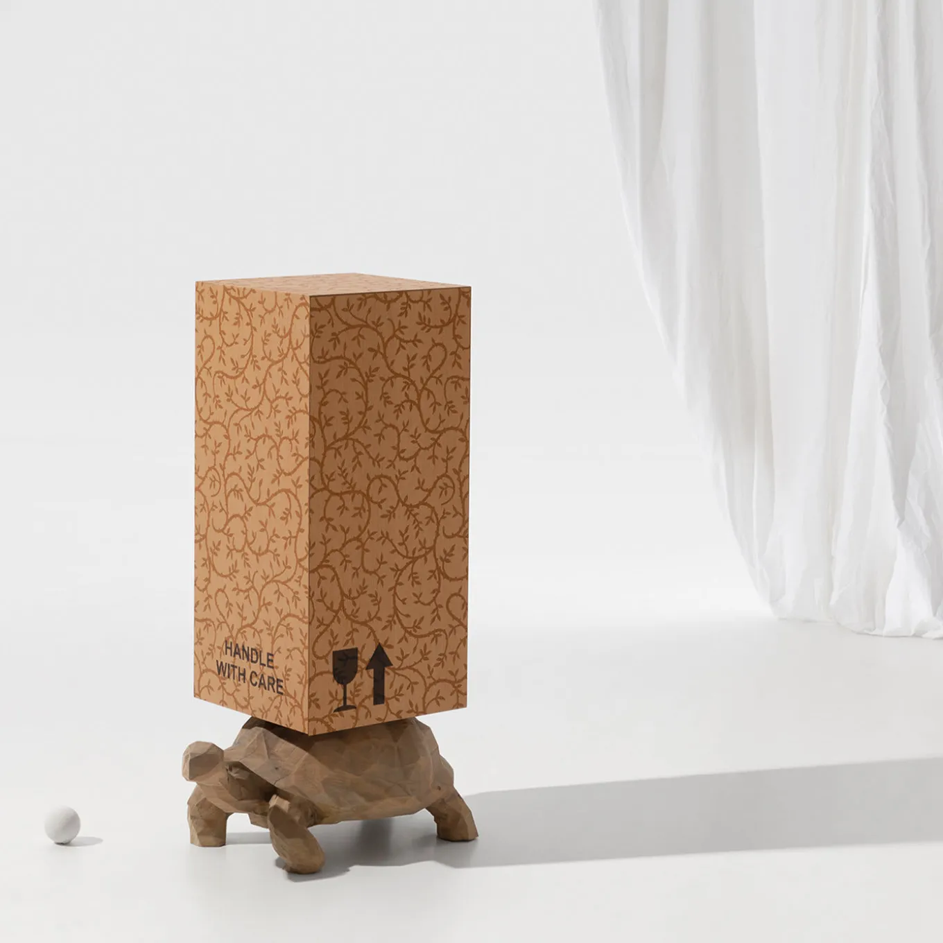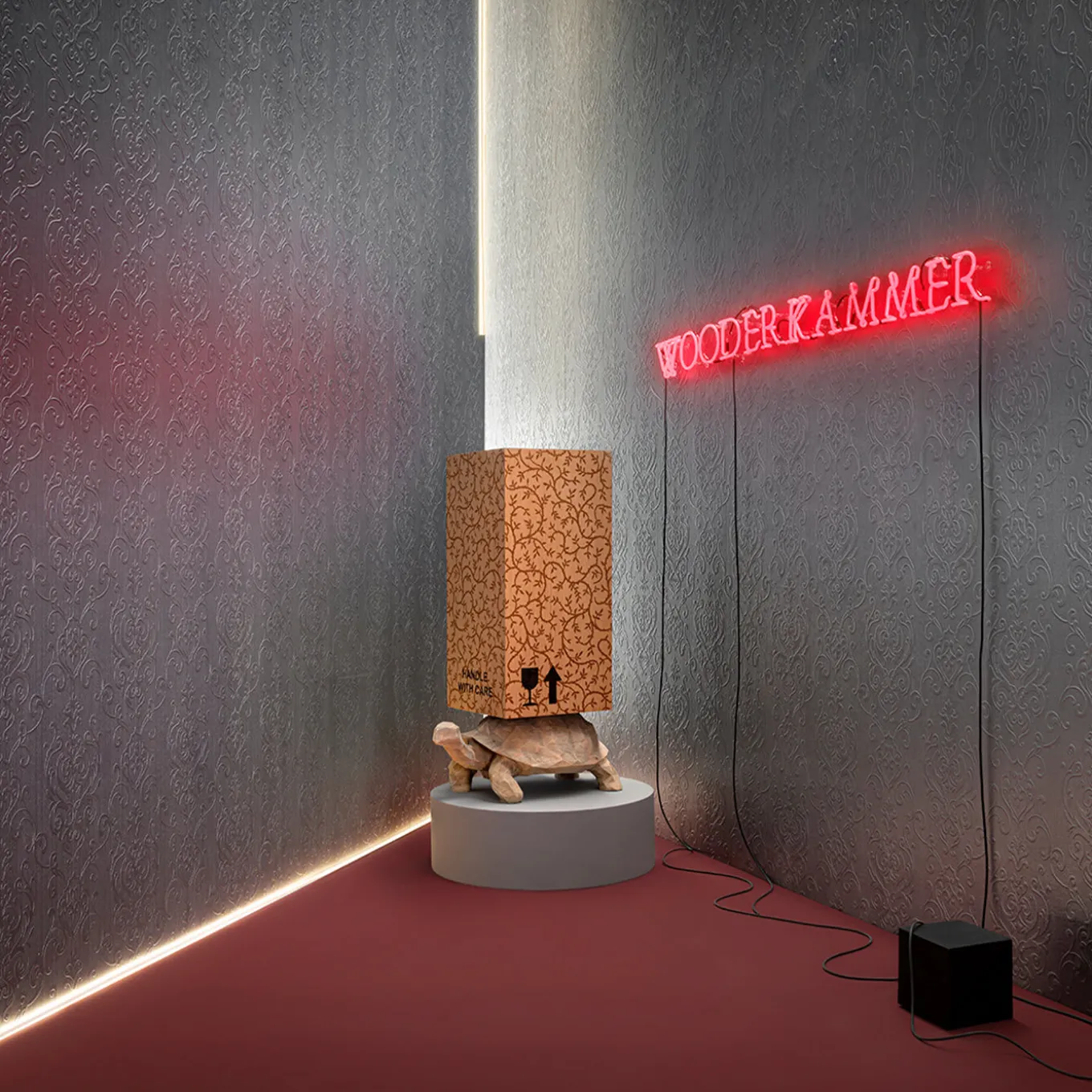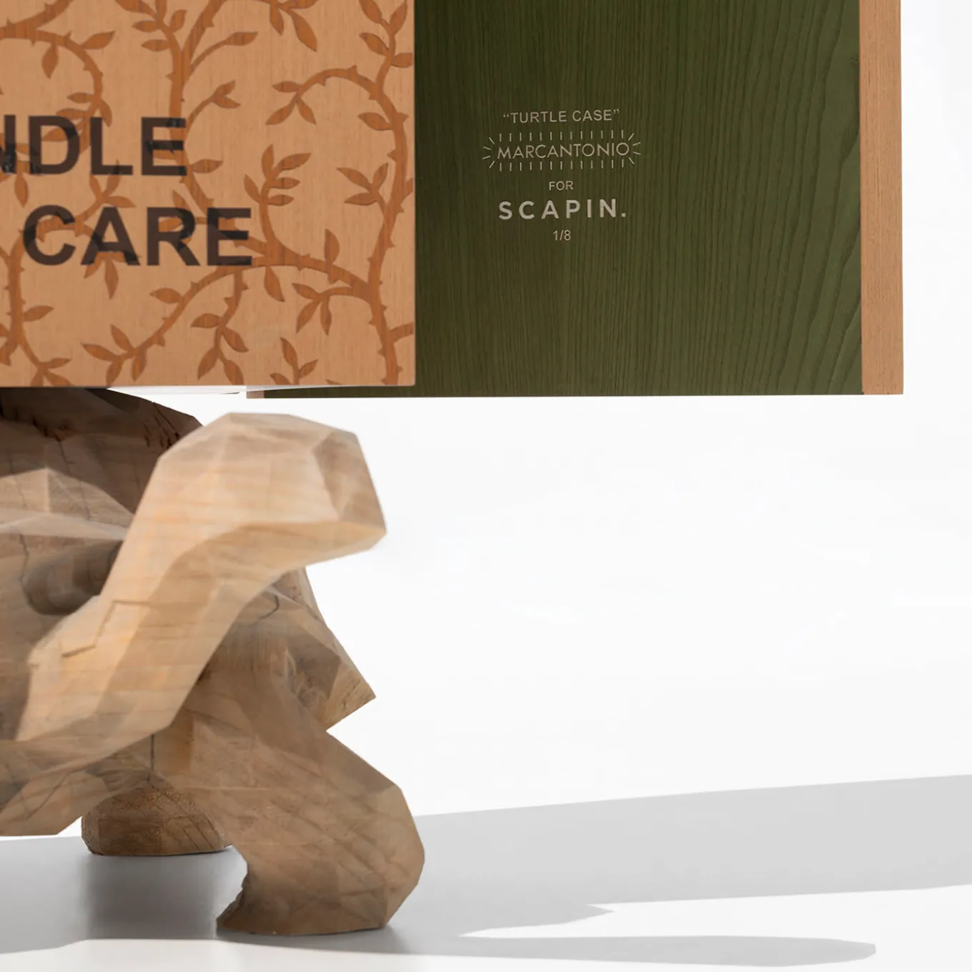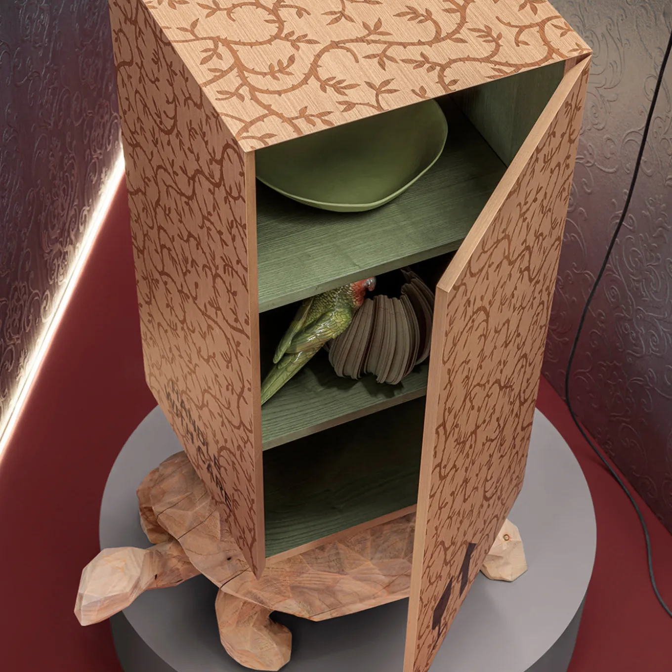 Part of the Wooderkammer Collection produced in a limited edition of only eight, this unconventional sculpture-cabinet is a statement-making piece composed of two contrasting elements. The turtle is entirely hand-carved from a single section of a tree trunk and supports a tall wooden case embellished with an exquisite inlay of sinuous branches executed entirely by hand. The interior is finished in olive green and the exterior features the fragile icon sign on one side, the artist logo and item number on the other, and “Handle with Care” in front.