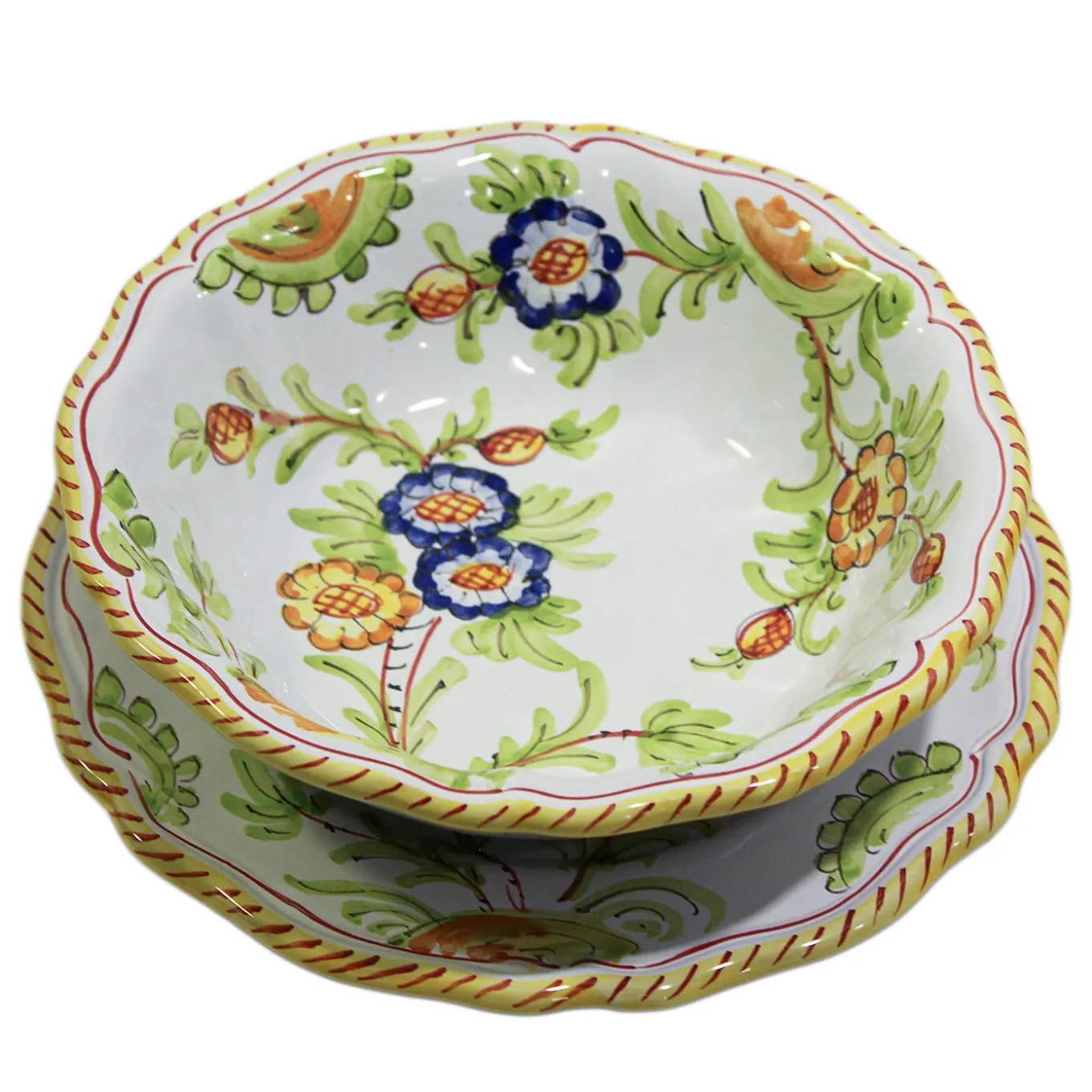 This gorgeous, 18th century-inspired tableware is completely handcrafted with the historical majolica technique by Florentine master artisans in Sbigoli’s workshop. Part of Lorenza Adami’s Tuscia Collection, this exquisite set showcases 6 soup bowls (19cm) and 6 plates (22cm) glazed and painted in vibrant hues of yellow, green, blue, and orange, and featuring a traditional graceful floral pattern. A truly charming set, which may be complemented by other table accessories from the same series to embellish the most refined classic dining tables.