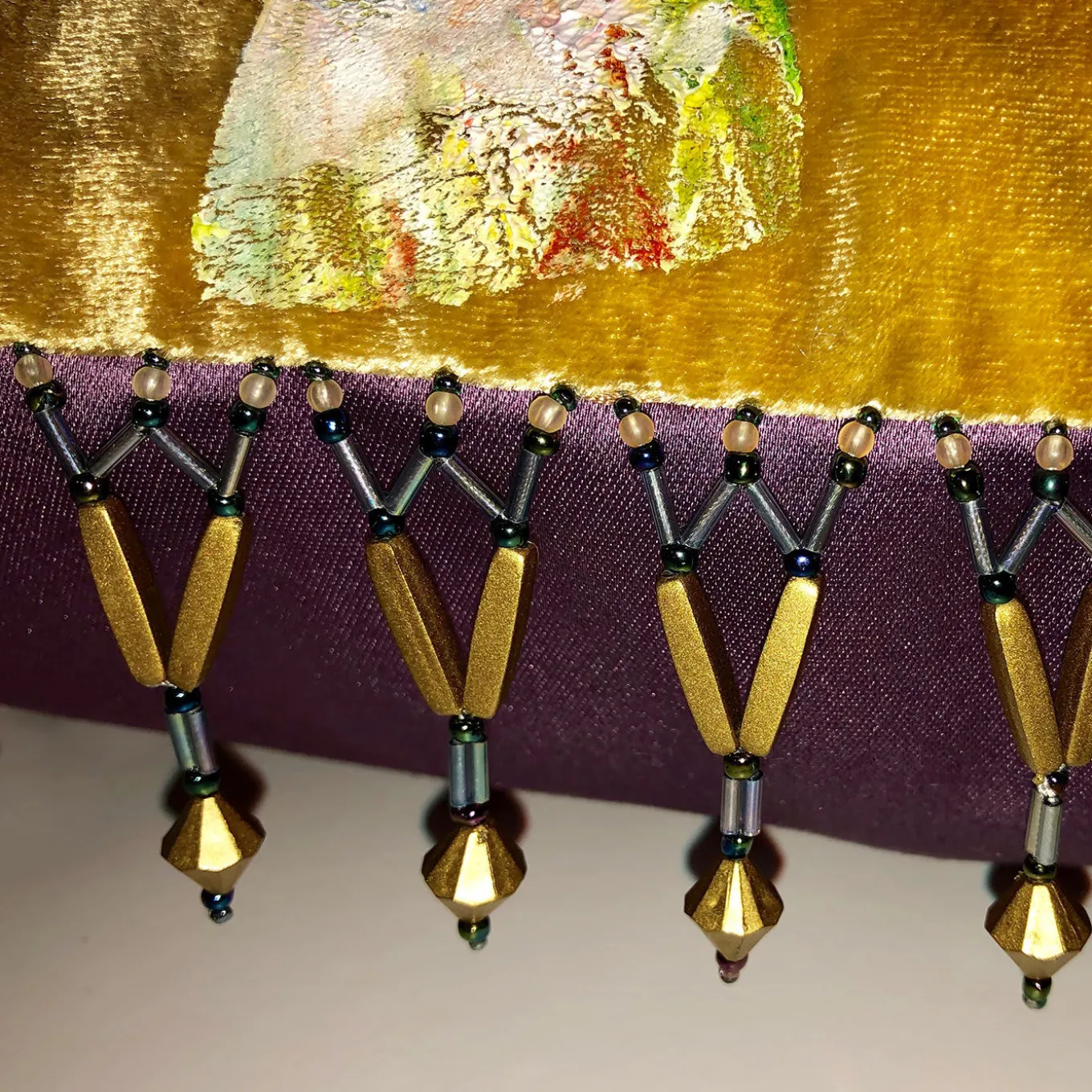 Delightfully artistic and beautifully luxurious, the silk velvet Two Fishes Cushion is dyed with yellow, gold and beige colors and hand painted with colored paste and gold leaf details. This deluxe cushion with a stunning design of two abstract fish features a trimming in glass beads and is complimented by a back in sumptuous purple silk.