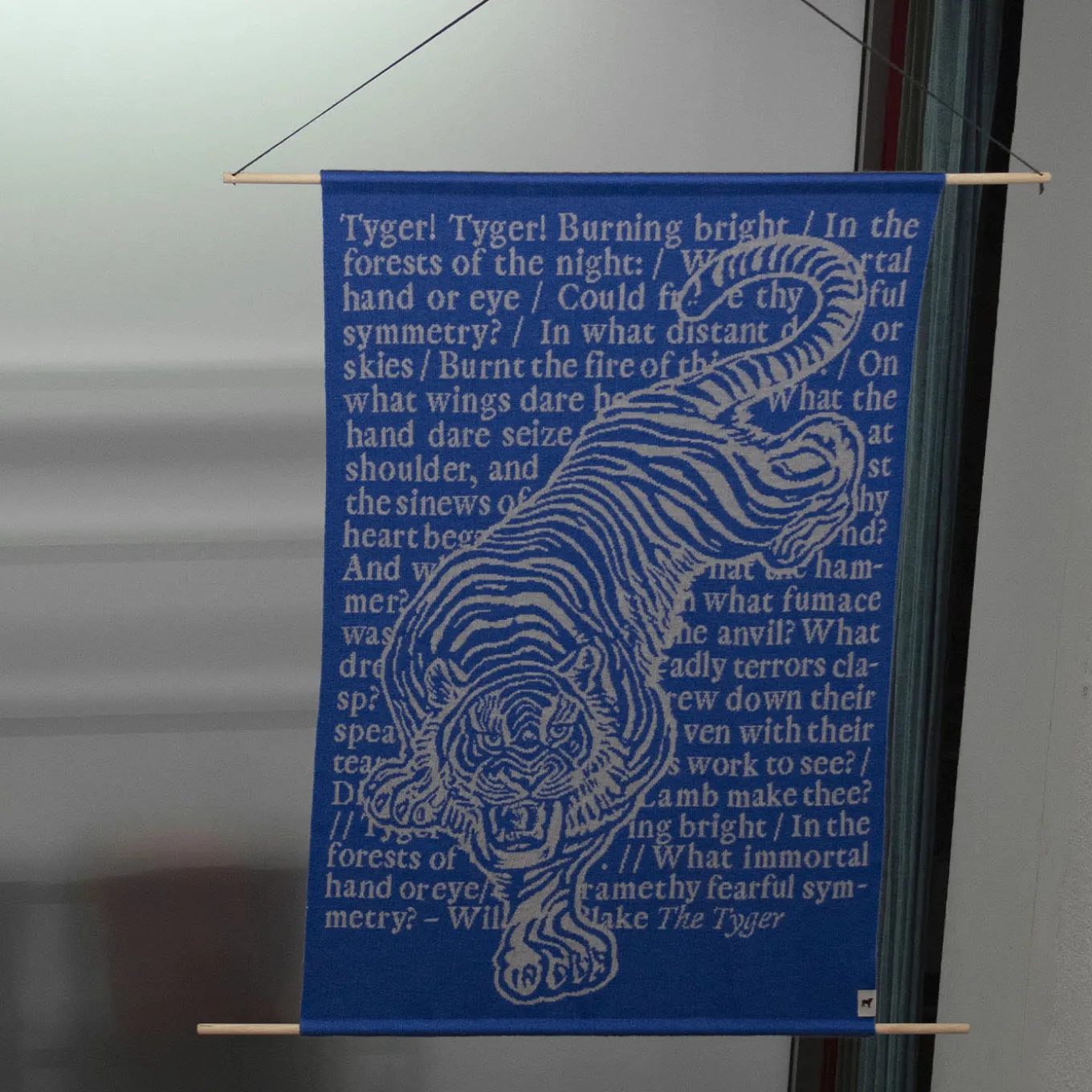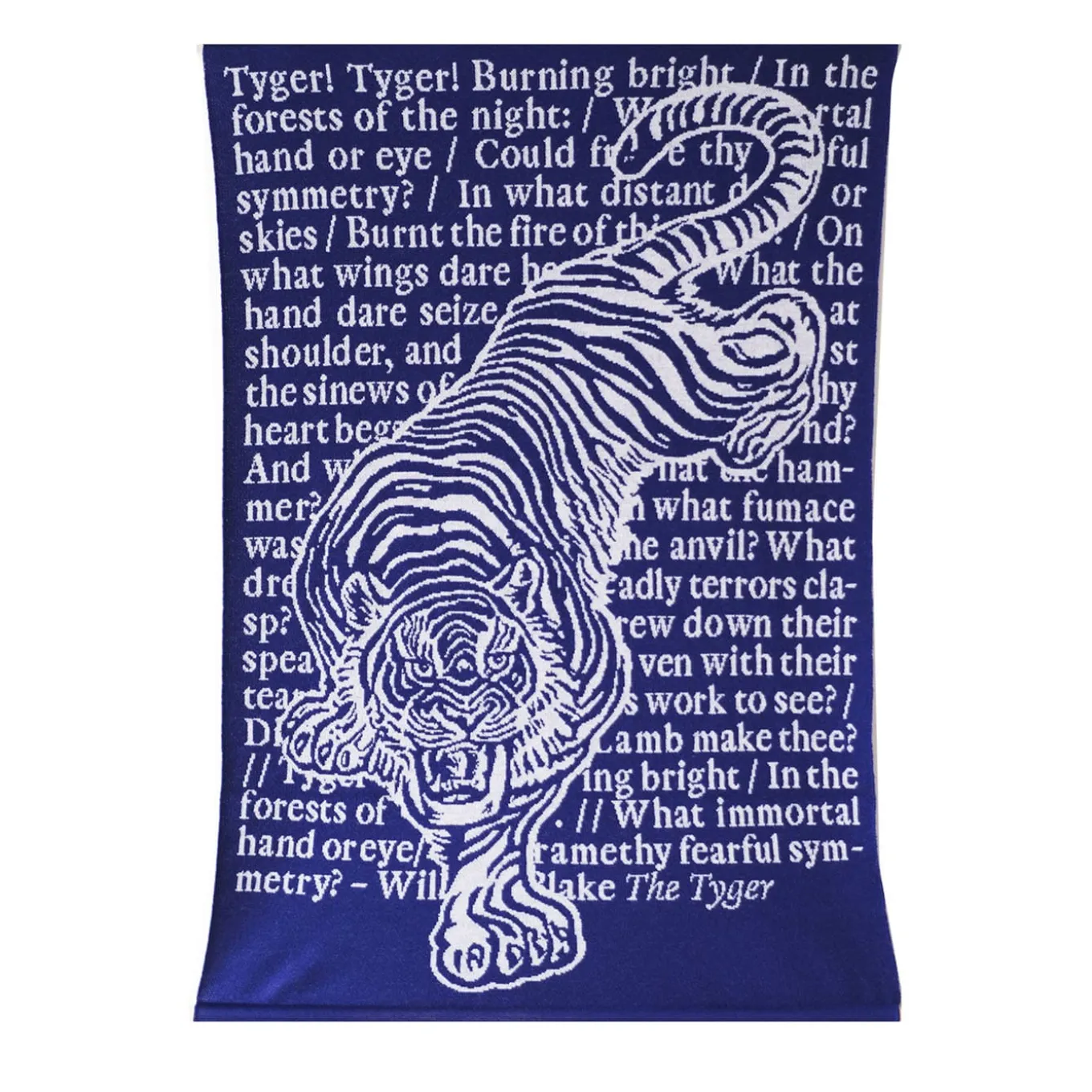 A powerful tiger strides silently across a red carpet covered in letters, it isThe Tyger by William Blake. Fascinated by its “fearful symmetry,” Blake portrayed the tiger as a creature of fiery forests, with blazing eyes and striped fur evoking terror. Opposite to the lamb, the tiger symbolizes humanity’s darker side and the struggles of adult experience. If both tiger and lamb share a creator, good and evil coexist within us, a profound mystery of nature. The tapestry is also available in red.