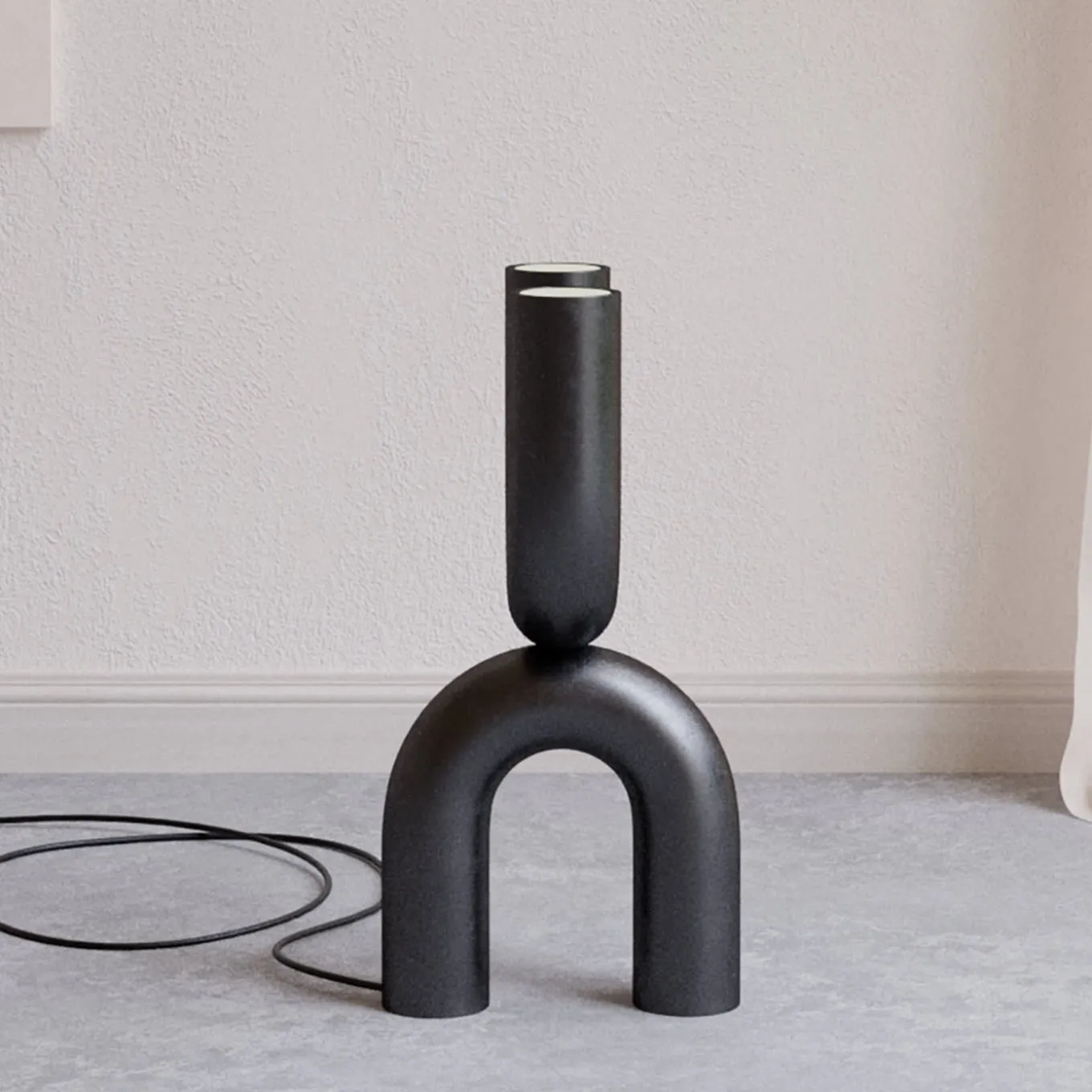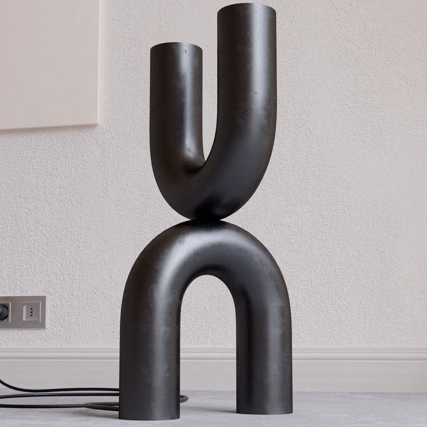 A totemic design obtained by piling two Us facing opposite directions, this stunning floor lamp will provide illumination while adding an exquisite artistic twist to corners of contemporary homes. The steel frame features a homogeneous black finish that also allows the design to add chromatic depth to light-toned, neutral decors.