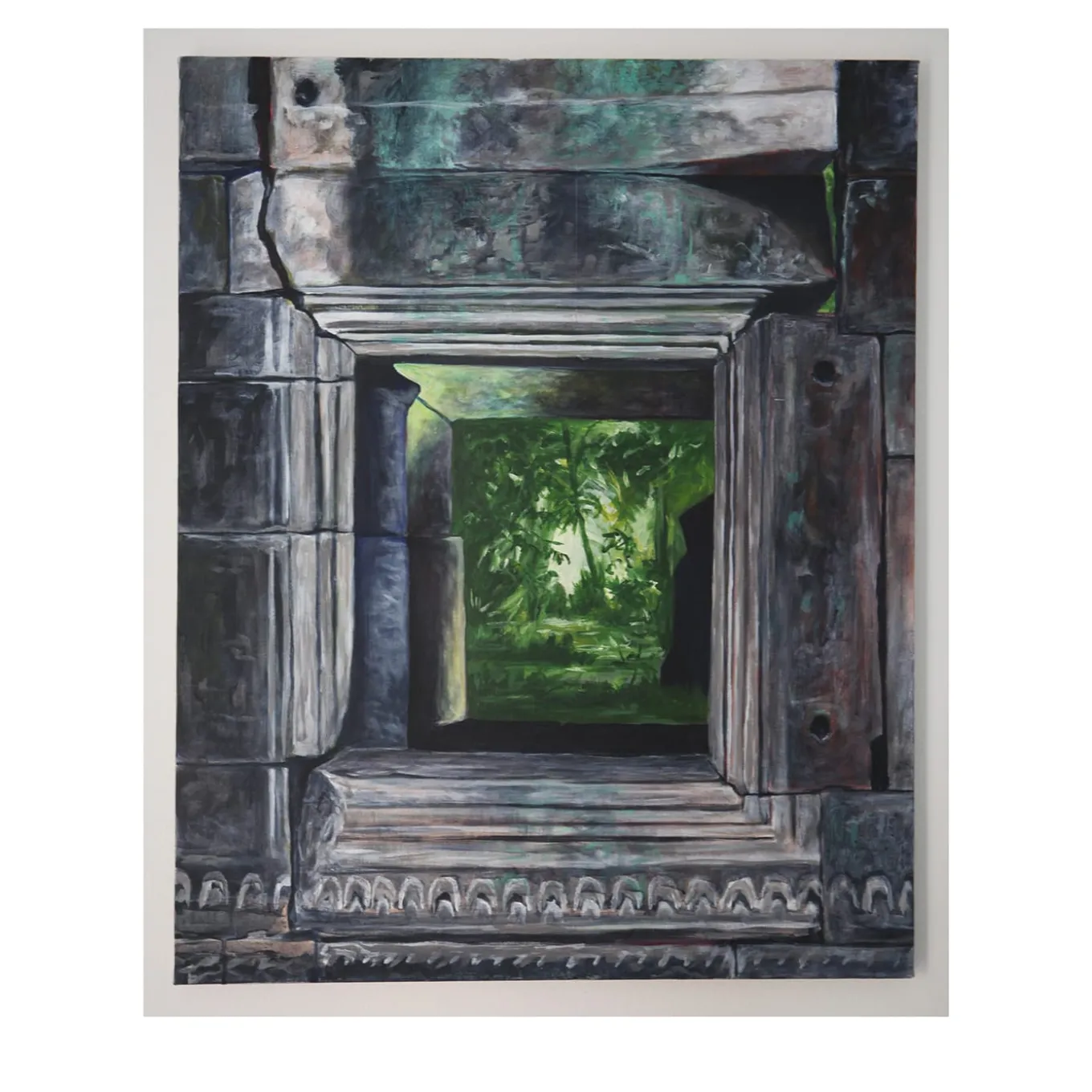 Fascinated by the naturalistic and spiritual charm of the Angkor Wat temple complex in Cambodia, artist Nicola Torcoli captured a glimpse of the jungle surrounding the ruins in the superb painting. Rich in contrasts and marked by a masterful use of perspective, this artwork was painted in 2020 using acrylics.