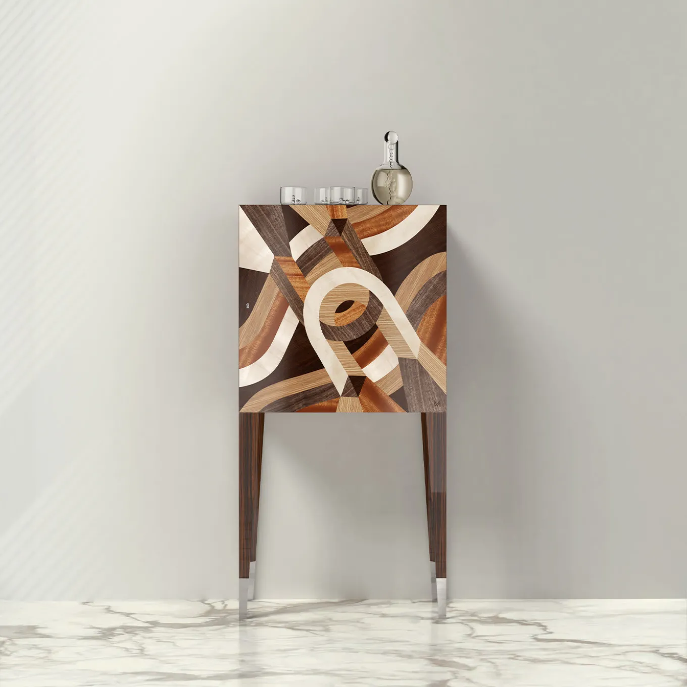 Wood becomes art in this sophisticated bar cabinet that embodies Marzia Boaglio’s crafting and luxurious style. The rectangular rosewood frame is supported by tall and slender legs with polished steel feet, the top unit showcasing a door with an inlaid design achieved by combining five different types of wood: maple, oak, mahogany, walnut, and wengè. The abstract geometric composition of curved and linear shapes moving in unexpected directions creates a stunning three-dimensional effect. The internal storage features mirrors, sensor lights and a drawer. Finish: Glossy Varnish.