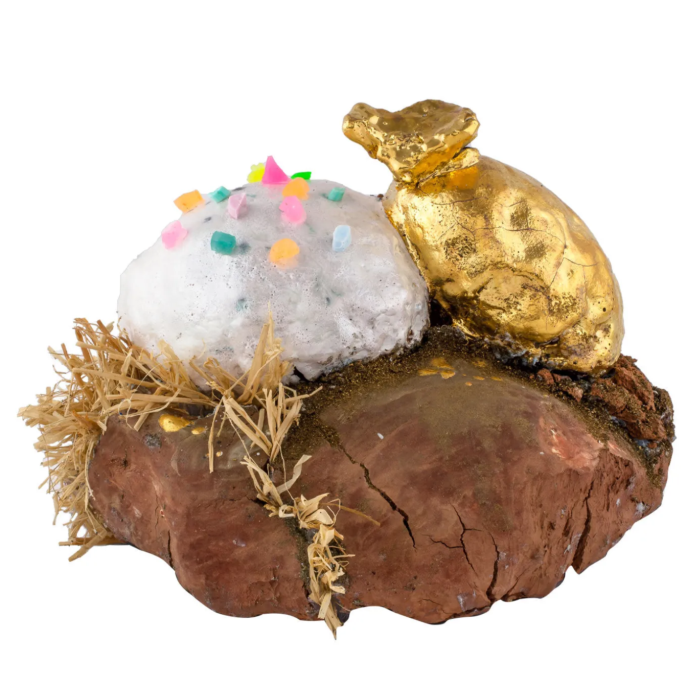 This range of original and artistic pieces is made in total freedom and experimentation, with the addition of silicone, crystals, porcelain animals and some small remnants from production. An unusual centerpiece creates a bond between people, making a wonderful talking point when entertaining guests. An earthy, rock style surface, with details of straw, color and gold, create a fascinating world.