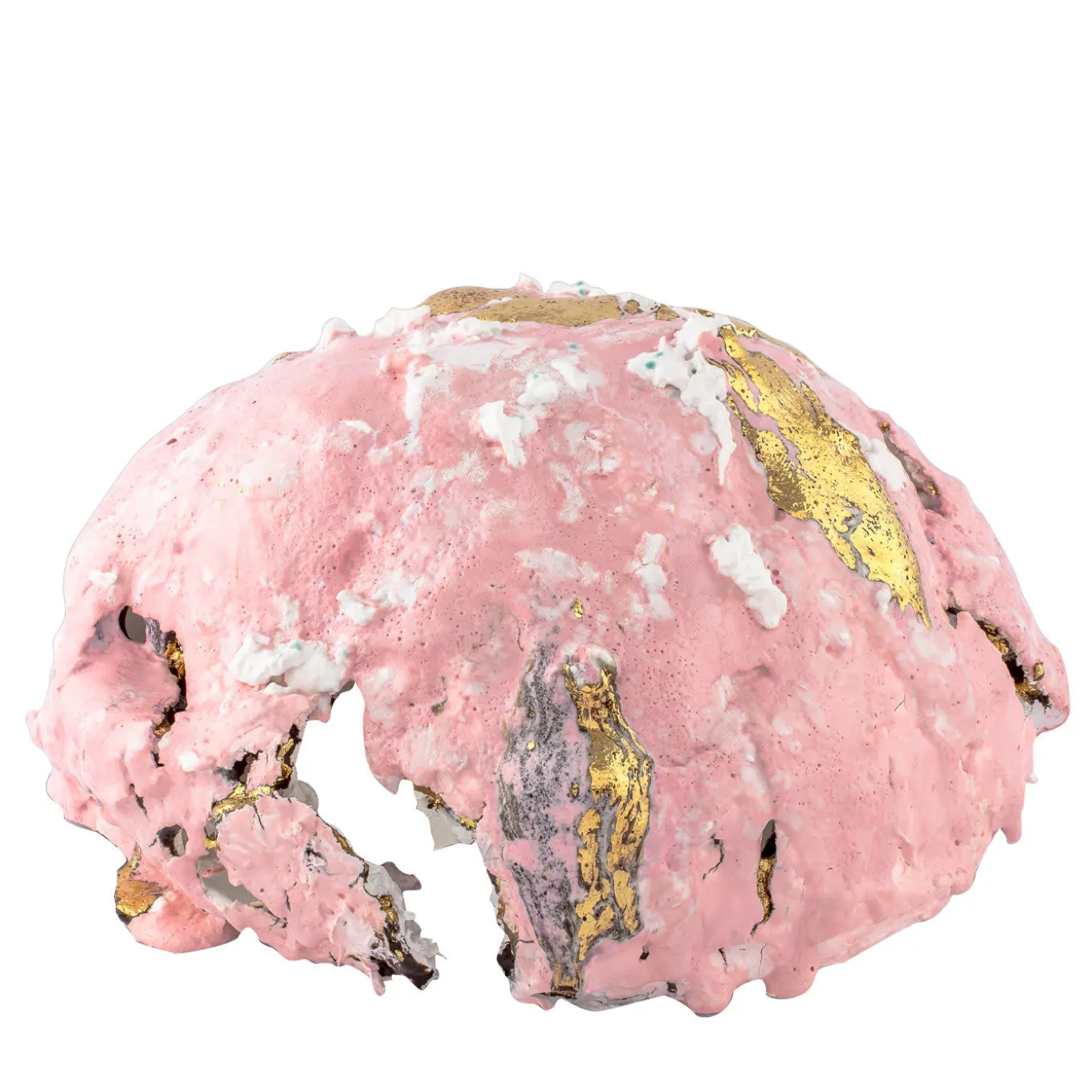 Featuring pastel pink color and gold detail over a hemispherical design, this fascinating piece is part of a series of original and creative items made in total freedom and experimentation, with the addition of silicone, crystals, porcelain animals and small remnants from production. An unusual centerpiece makes a delightful talking point when entertaining guests, creating a bond amongst all.