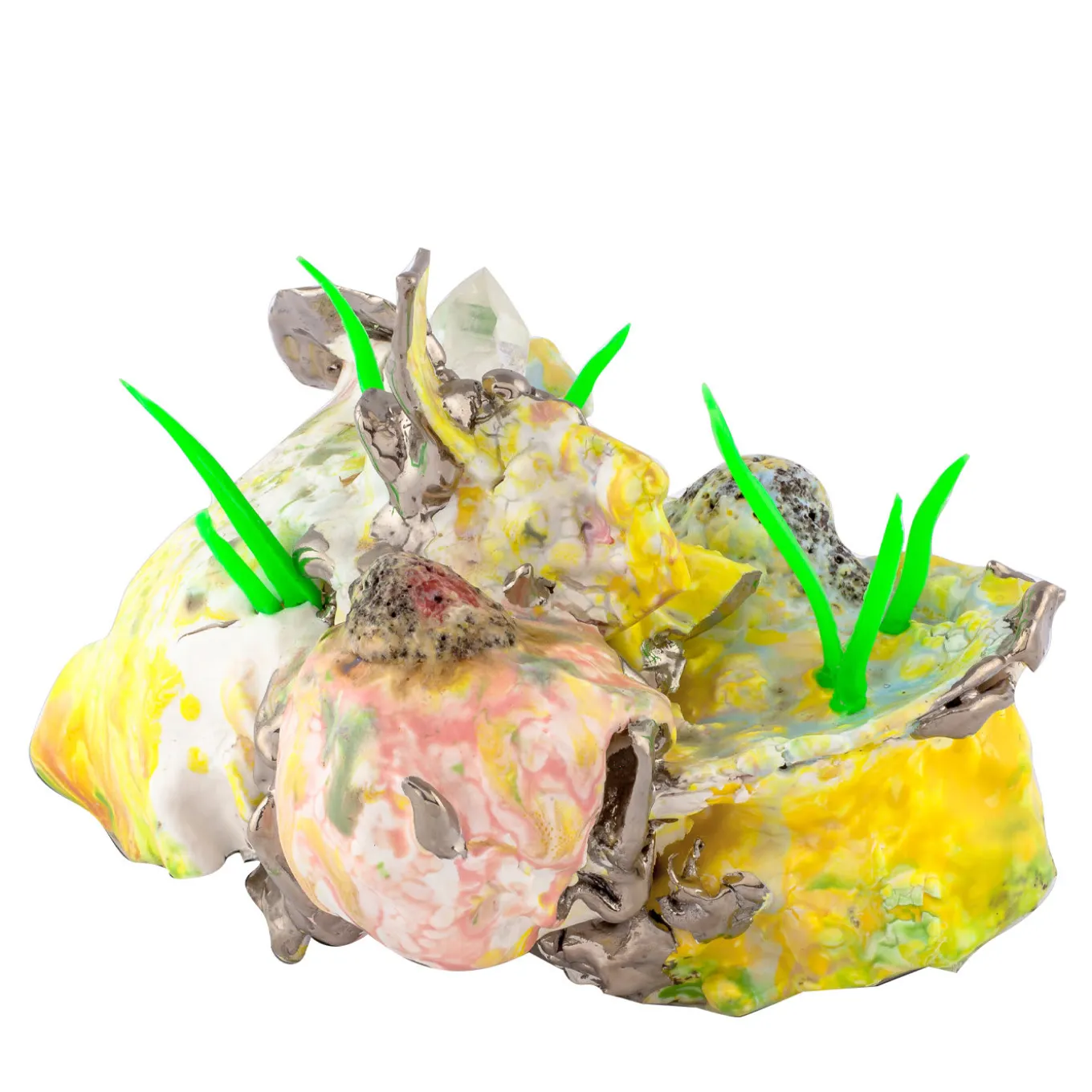A fascinating landscape to explore, this eccentric artwork features vibrant colors and gold detail. These pieces are made by experimenting in total freedom, with the addition of silicone, crystals, porcelain animals and some small remnants from production. An unusual centerpiece makes a delightful talking point when dining with guests, creating a bond amongst all.