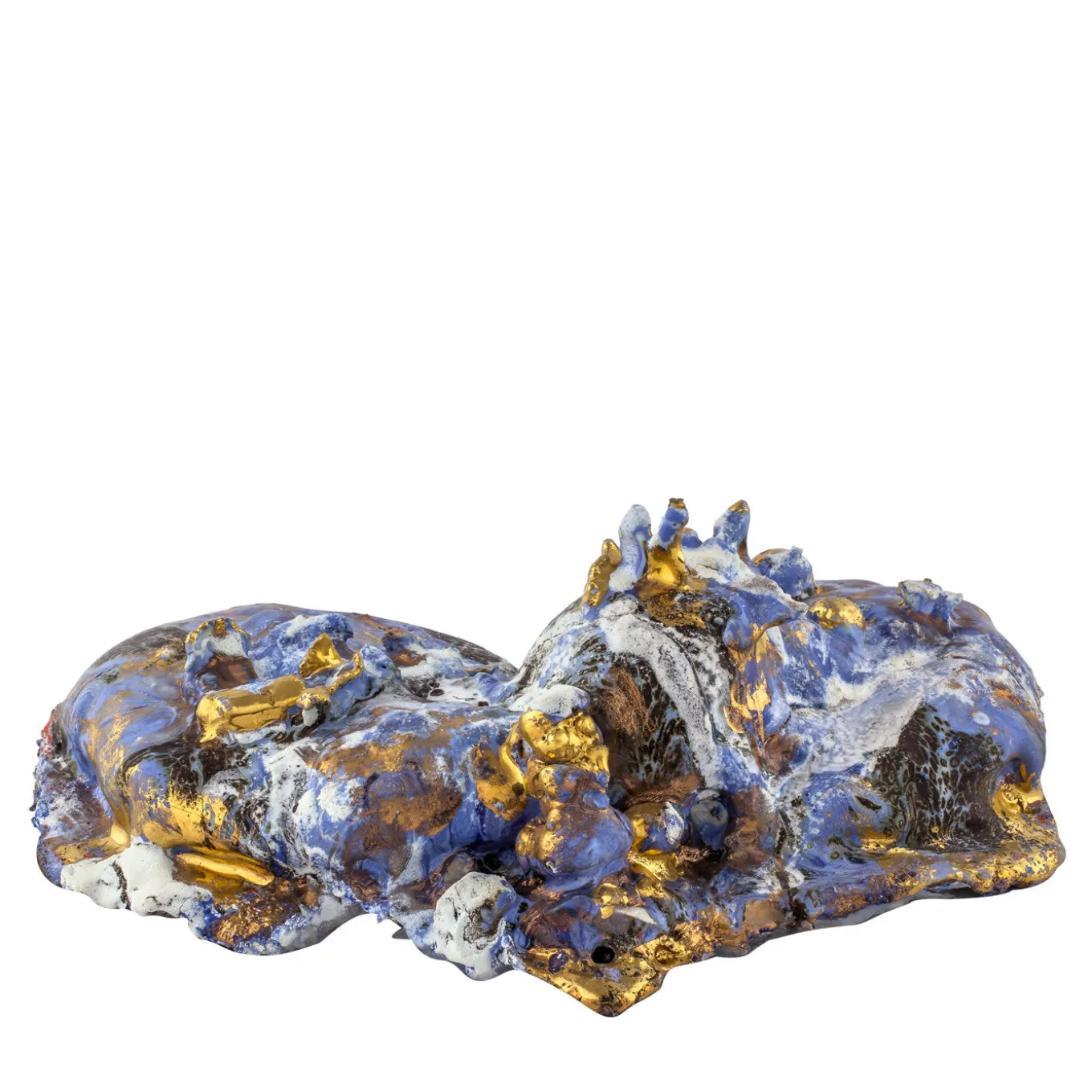 In an intriguing world of artistry, these pieces are made in total freedom and experimentation. Adding decorations in silicone, crystals, porcelain animals and small remnants from production, they form a world to explore with a rock style surface in deep purple and featuring splendid gold detail. This centerpiece will be the focal point of any table setting.