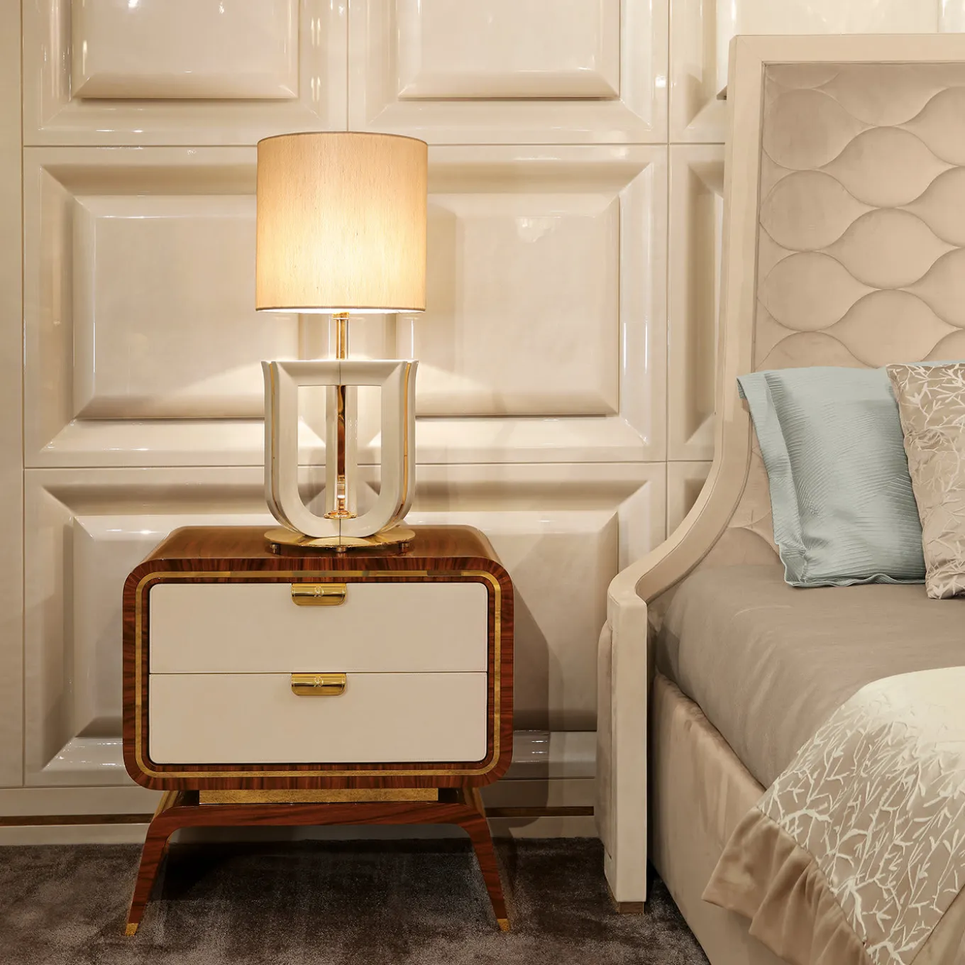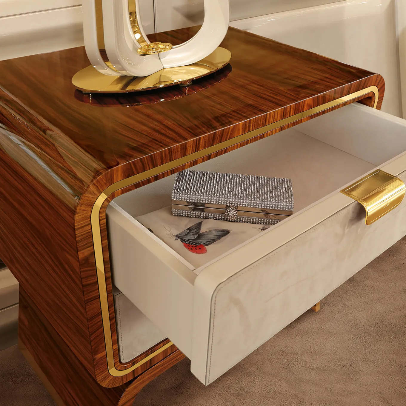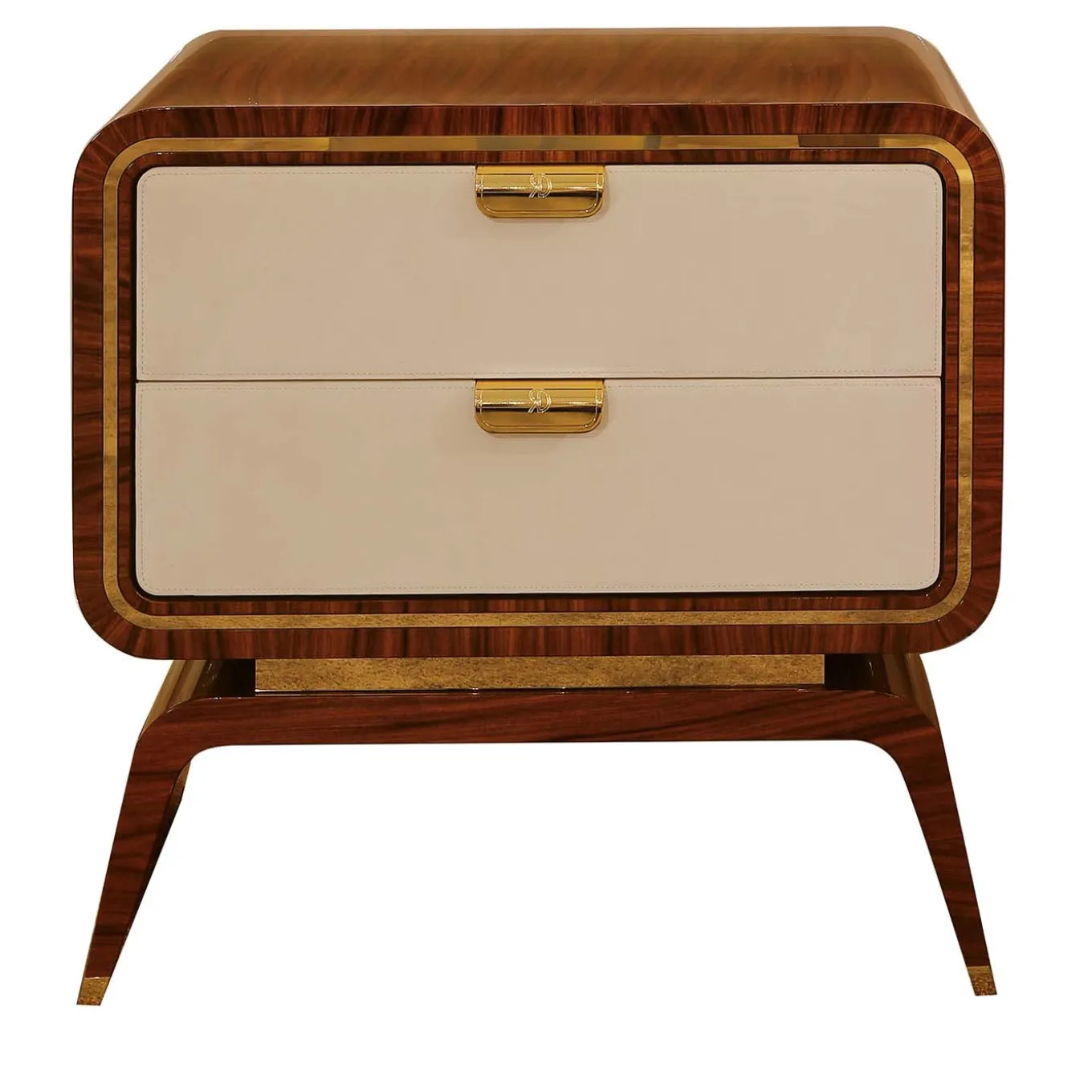 This Scandinavian-inspired bedside table is crafted from solid wood. Its Palissandro Santos veneer finish exudes a warm elegance, enhanced with gold metal accents for a luxurious touch. The Unique Night Table features two soft-close drawers with stitched nubuck fronts, making it a stylish yet highly functional addition to the home.