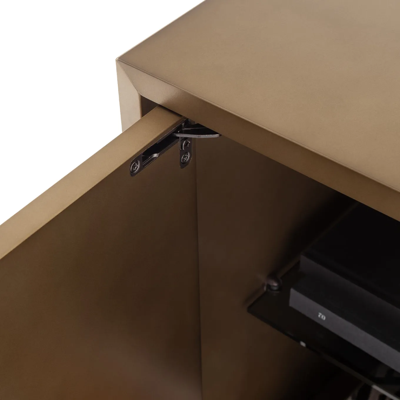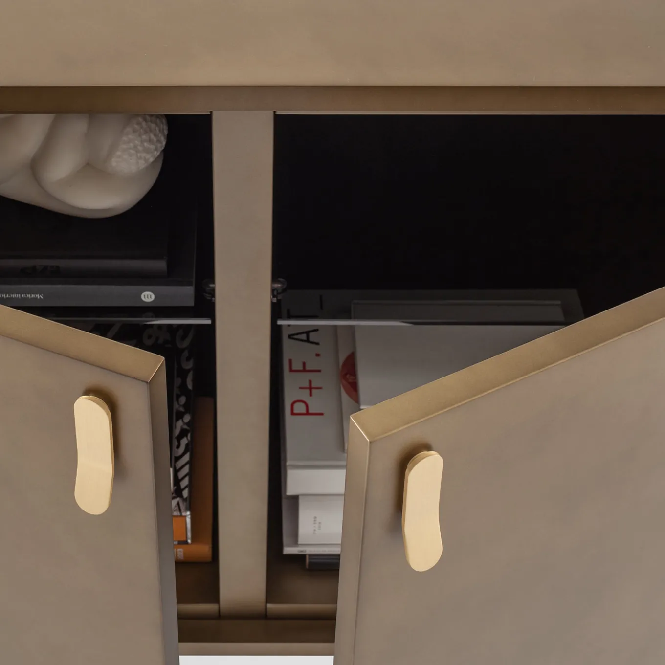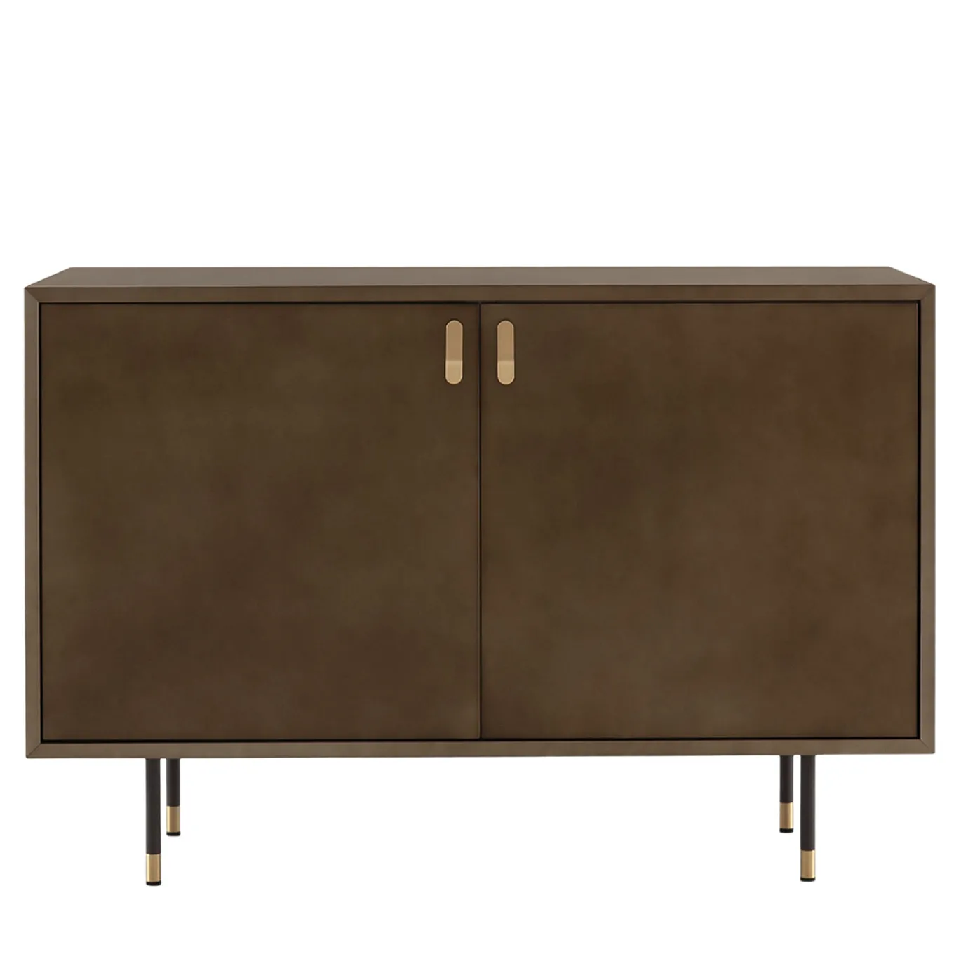 The Universe 2-door bronze bar cabinet features oxidized bronze lacquered doors accentuated with brass handles that highlight its refined hues. Inside, two smoked glass shelves offer spacious storage. Supported by a darkened metal frame with brass details, this cabinet blends sleek design with functional elegance, ideal for contemporary interiors.