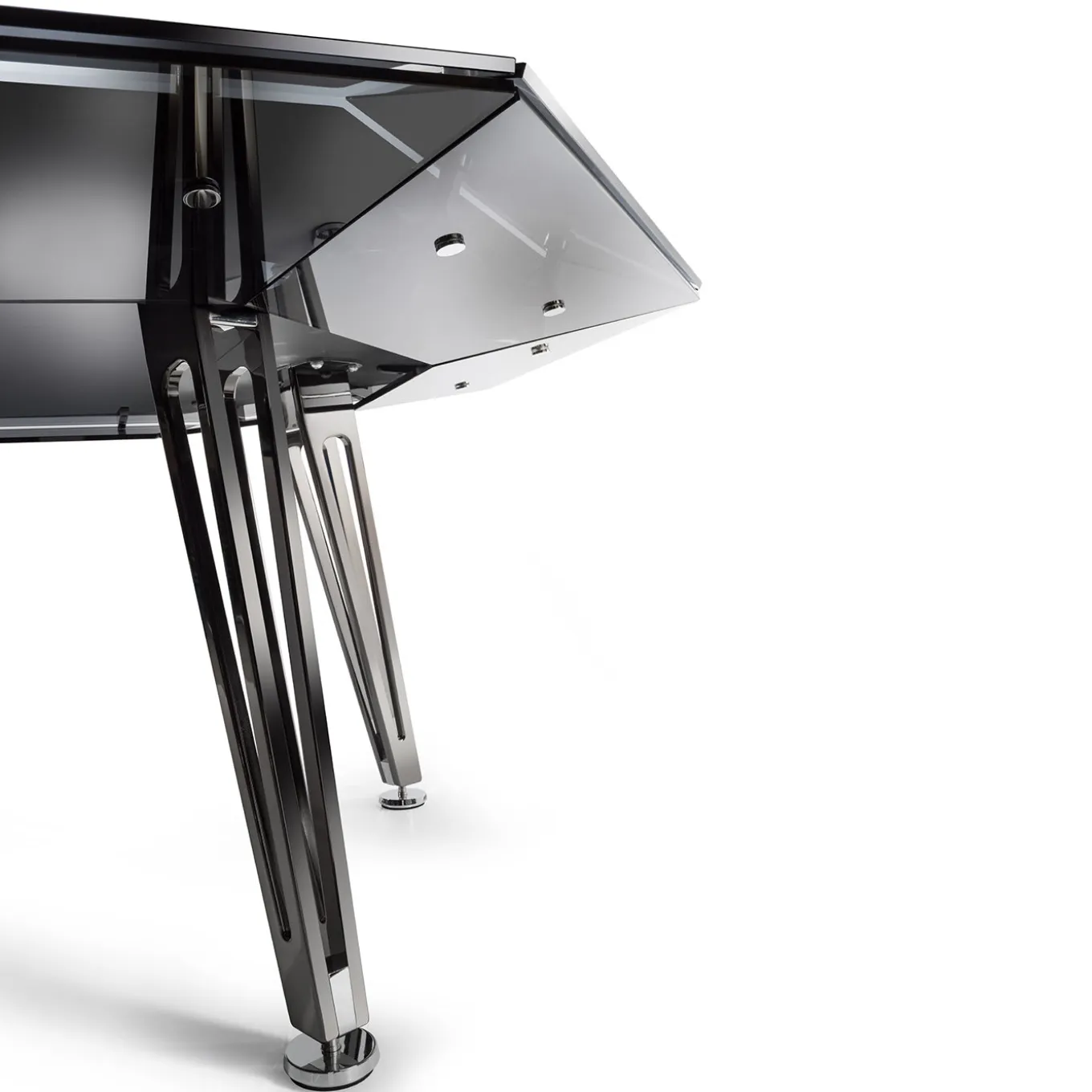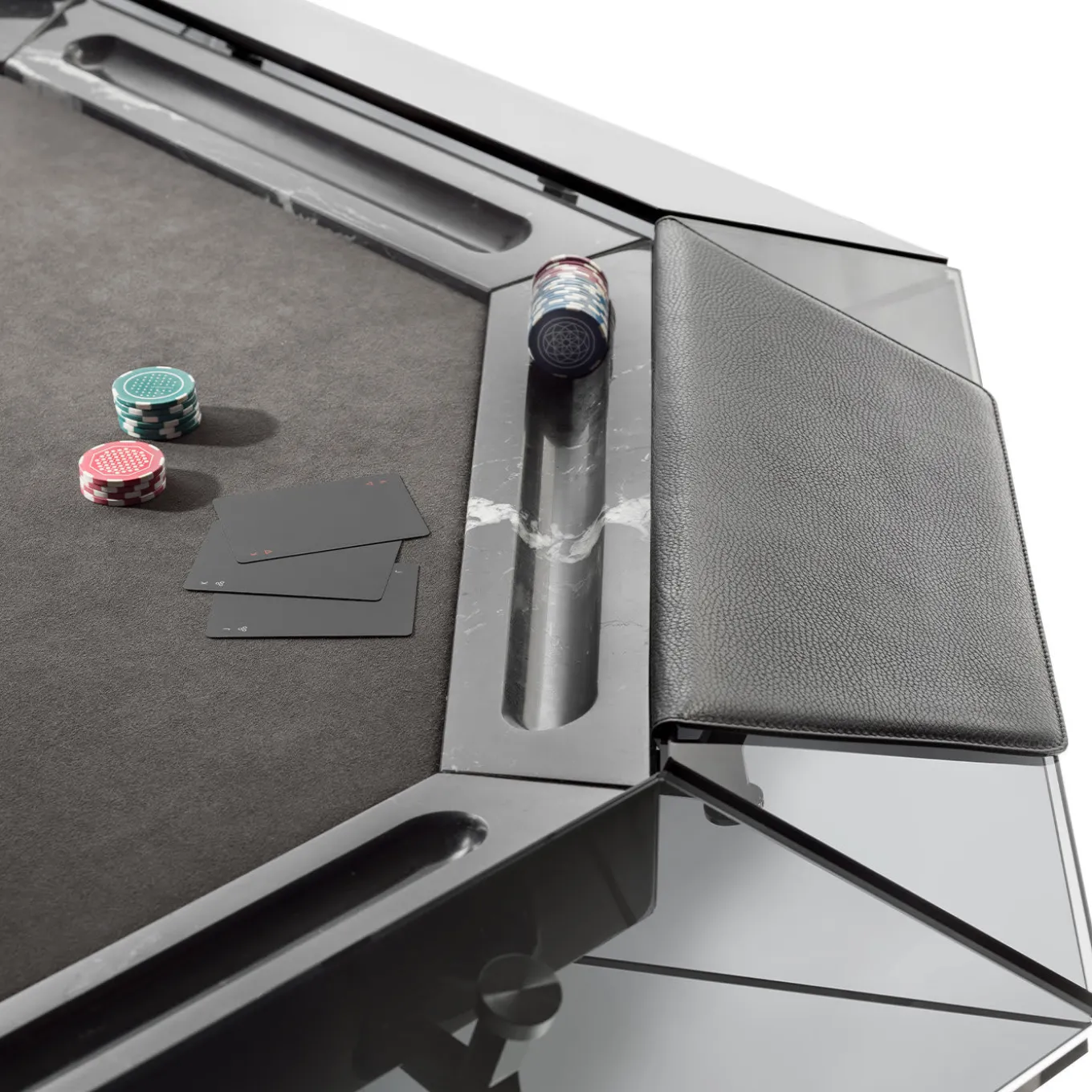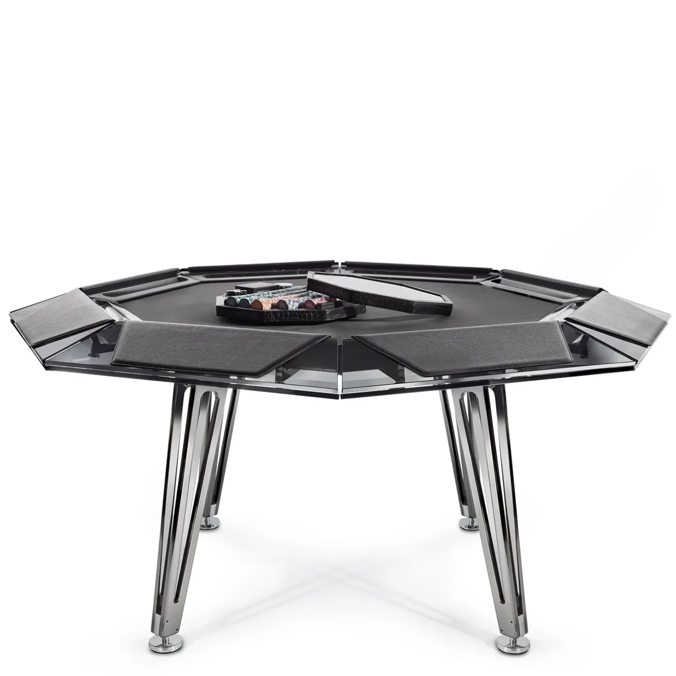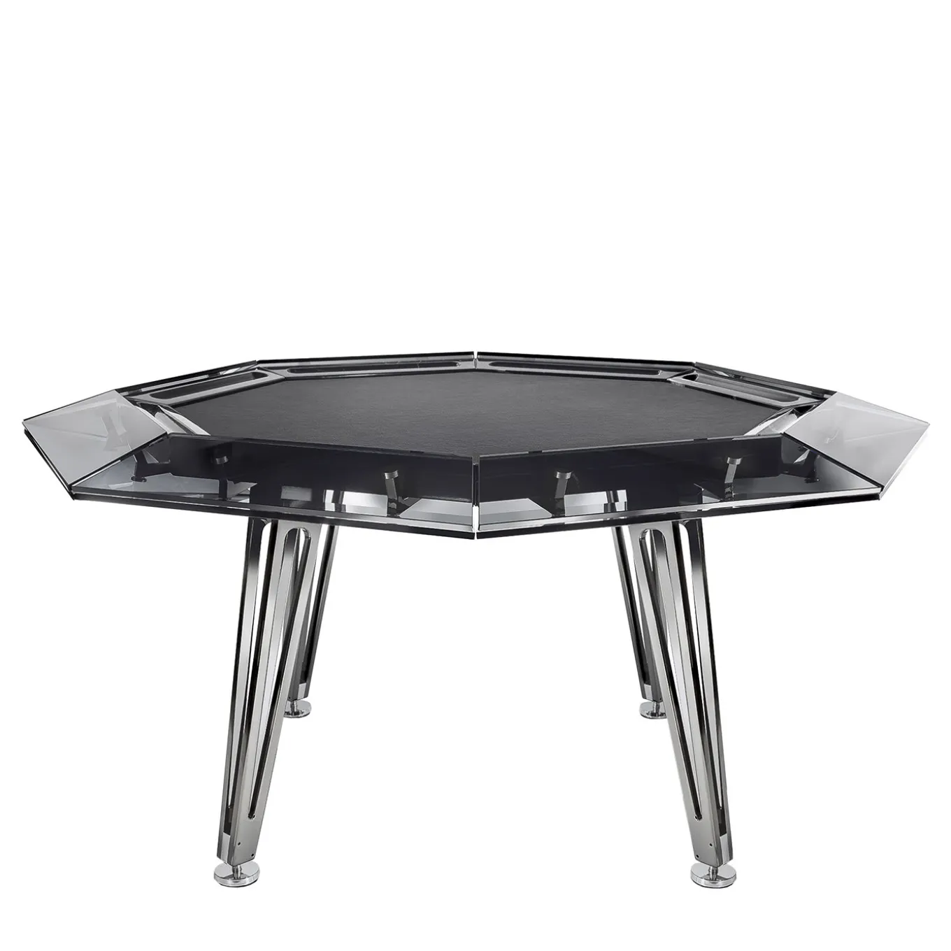 A true gem for home game rooms, this octagonal poker table for eight players boasts a captivating, distinctly contemporary design, rich in fine materials and sharp corners. Four splayed metal legs enriched with a black chromed finish sustain the glass structure, inspired by the classic appearance and cut of diamonds. a bold frame embraces the black game mat in Alcantara®. Leather armrests available at an additional price, while a lavish game set is included with purchase.