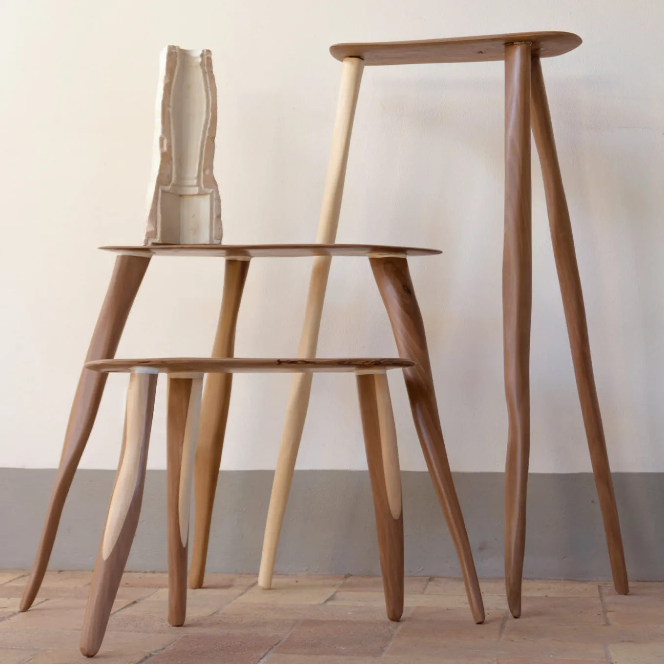 Crafted entirely of scrap wood and leftover cuts of Canaletto walnut and maple, this stylish trio strikes with its sleek profile and tall slanted legs. The sculpted side tables enhance the grain of the wood, guaranteeing a sublime charm and one-of-a-kind look. The legs are inserted into the top through a solid joint, providing resistance and durability over time. The tables measure (in cm) 70x30xH42, 80x40xH60, and 80x40xH100. The top and height can be customized, please ask the Concierge for details.