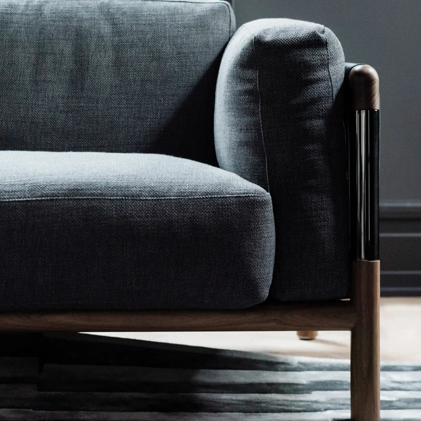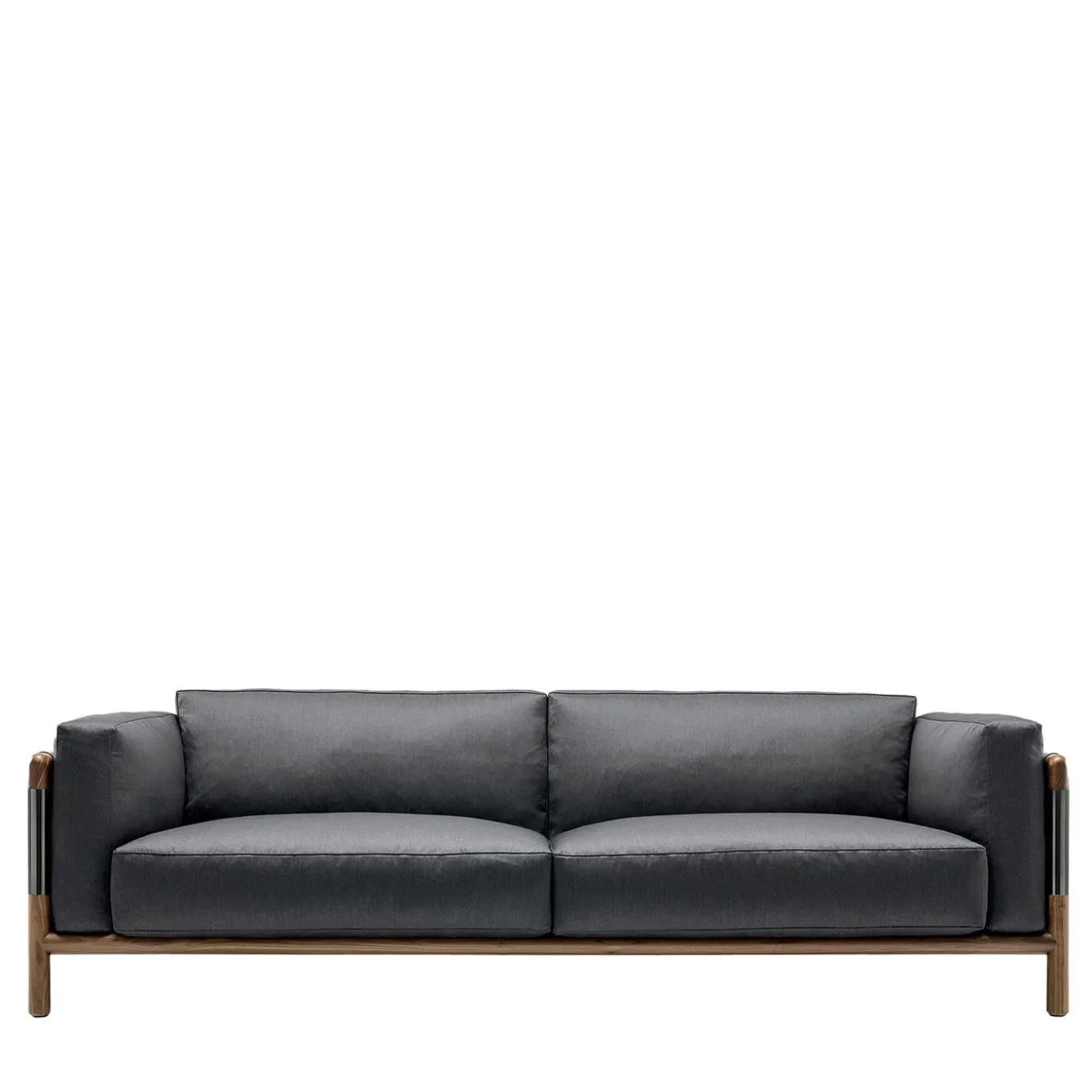 Clean and sophisticated, this sofa is distinguished by a minimalist design of exceptional comfort. It features a fiber-padded solid Canaletto walnut structure, enriched with a Canaletto-covered steel bar on the two seats. The cushions are padded with goose down and multi-density polyurethane foam, ensuring long-lasting comfort. Completed with polished nickel-finished metal details, it is upholstered with a removable fabric or leather cover upon request to the Concierge.