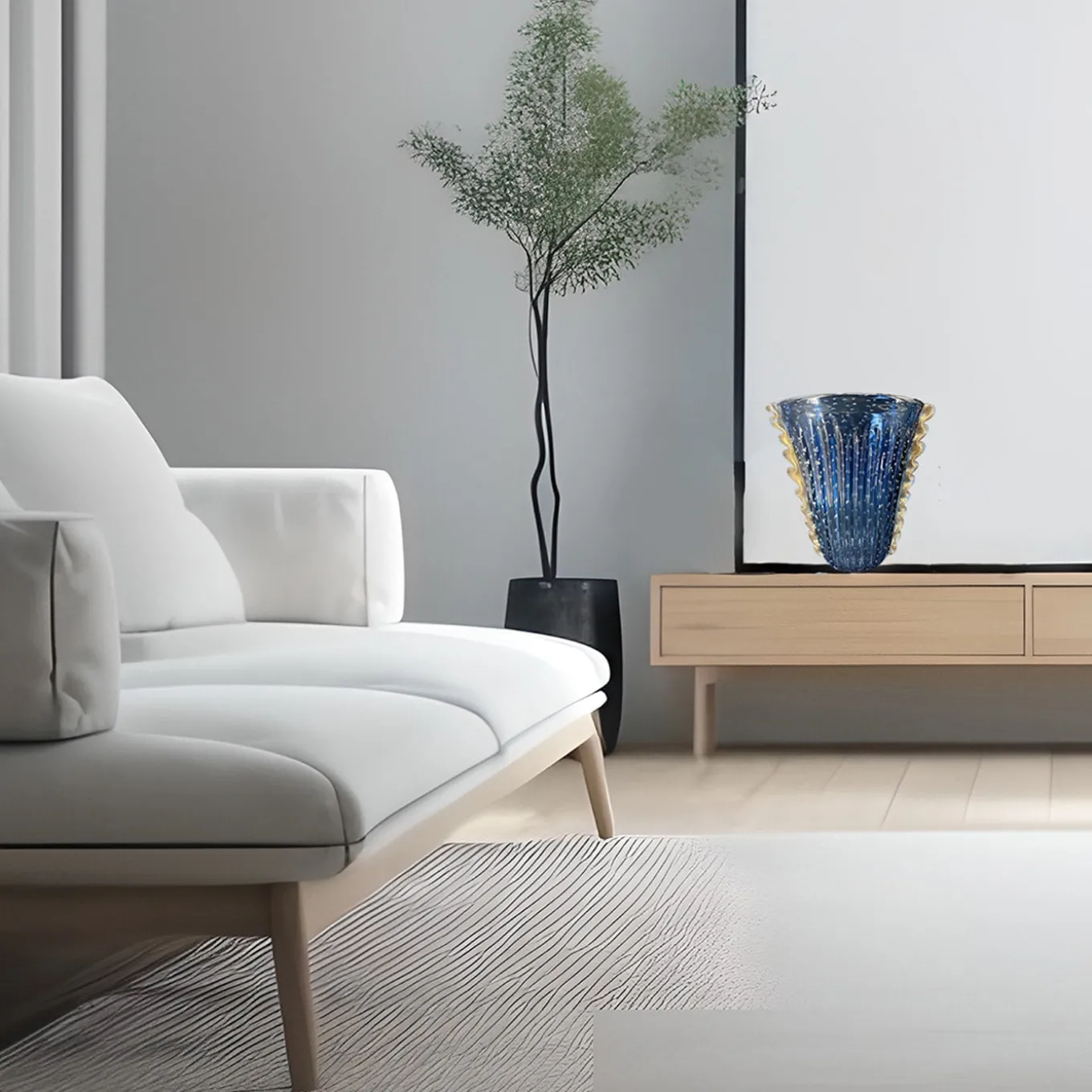 An authentic work of art fashioned of prized Murano glass, this navy-blue vase brims with timeless allure. Characterized by a flounced texture and air bubbles trapped within – obtained with the submerged “balloton” technique – its decorative impact is maximized by the presence of 24K gold particles and wavy clear glass applications achieved by following the “incalmo” technique. An originality certificate is included with the purchase.