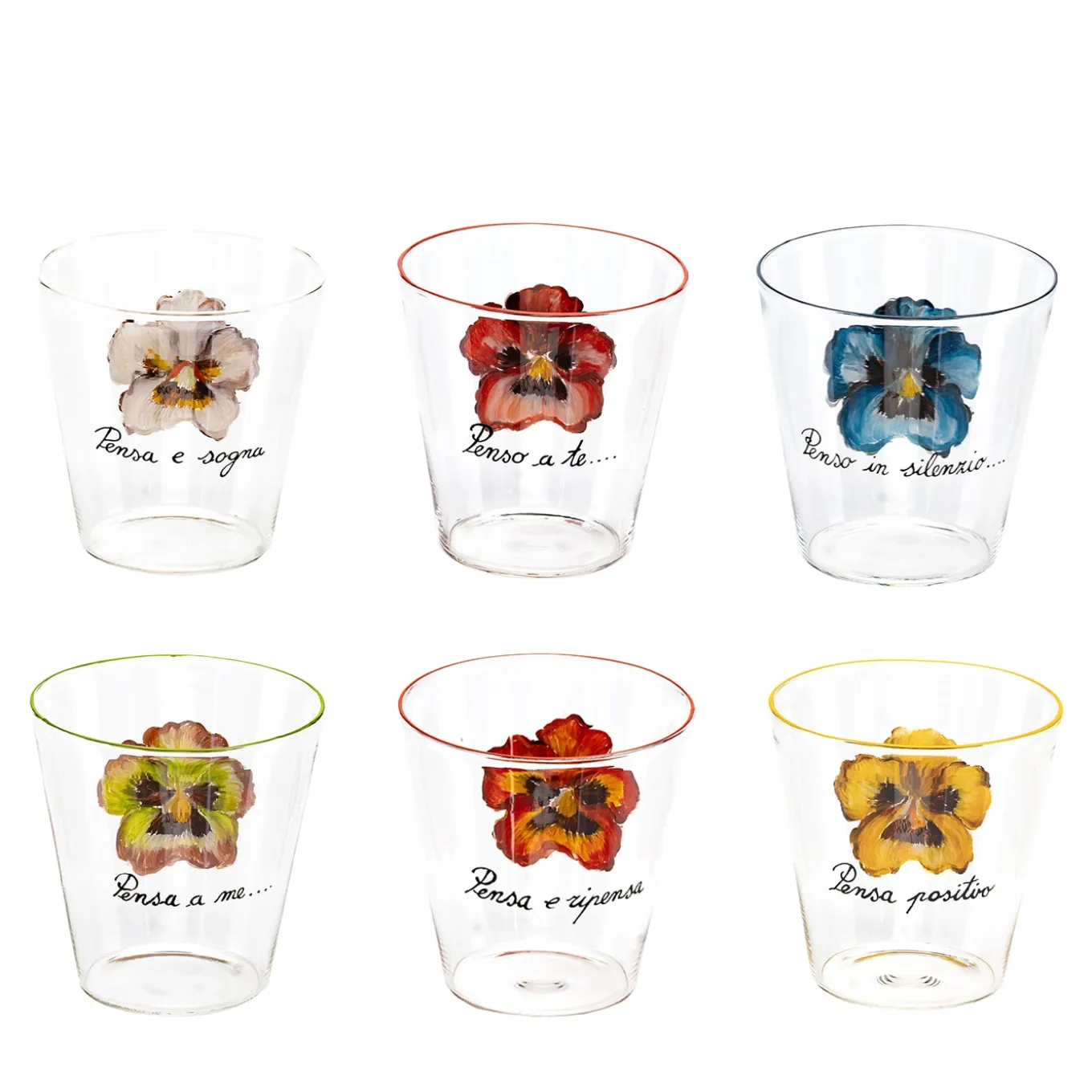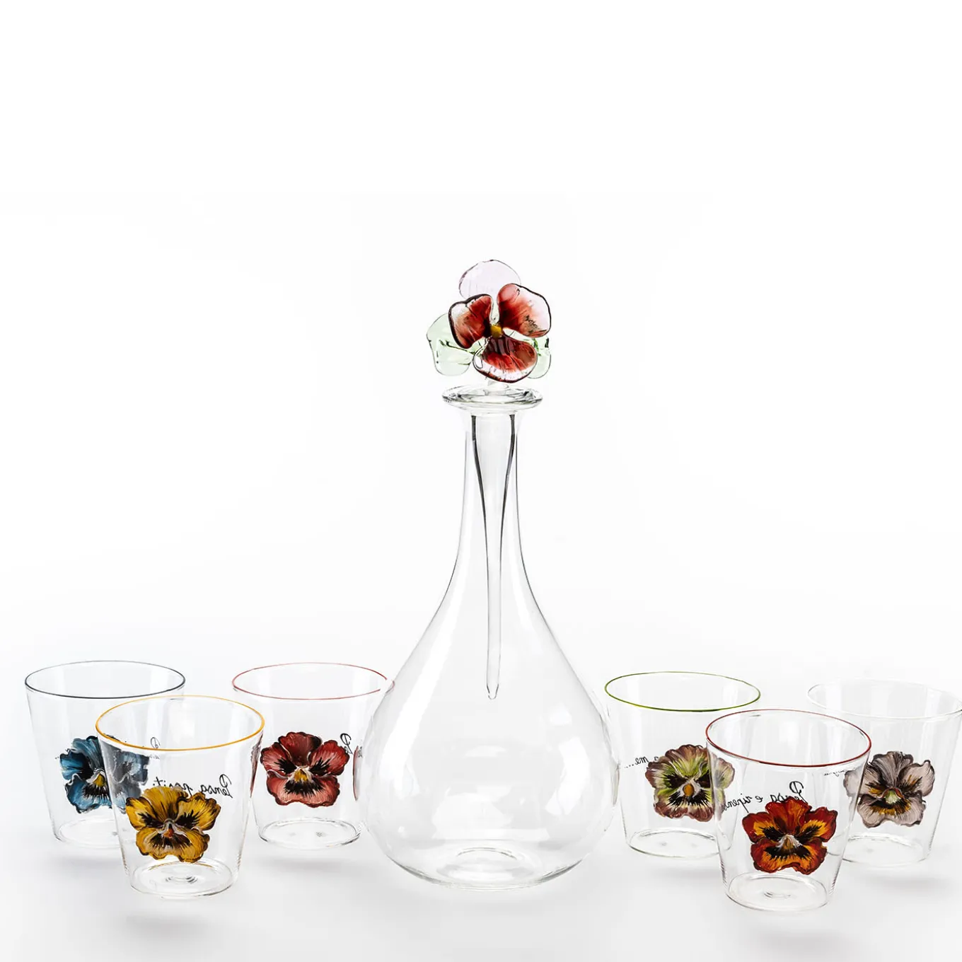 A superb design masterfully handcrafted of mouth-blown glass transparent glasses with hand-painted pansé flowers and short composition. Italia’s vibrant pansies, known as violets of thought, inspire the captivating Casarialto Va Pensiero collection. Each hand-painted glass is an ode to togetherness, sharing, and the warmth of home. Every glass is meticulously handcrafted in Italy, mirroring the artistry of nature in fine, unique, and traditional craftsmanship.
