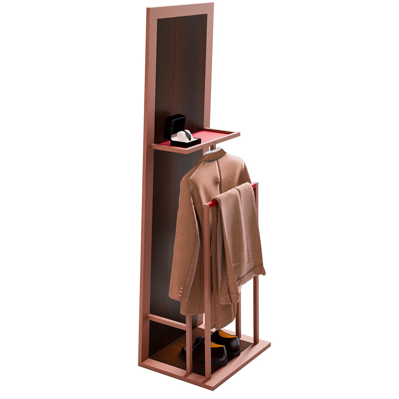 A modern take on an iconic piece of furniture, this valet mirror showcases masterful craftsmanship and quality of materials in a simple yet elegant piece that will add functionality to a modern bedroom or entryway, thanks to its full-length mirror. The metal frame with a brushed-copper finish supports a rectangular mirror while the back has a trouser hanging rail, a shirt hanger, a shoe stand, and a red leather-lined vide poche. This valet mirror is the perfect solution for small interiors to keep clothes organized in one place.