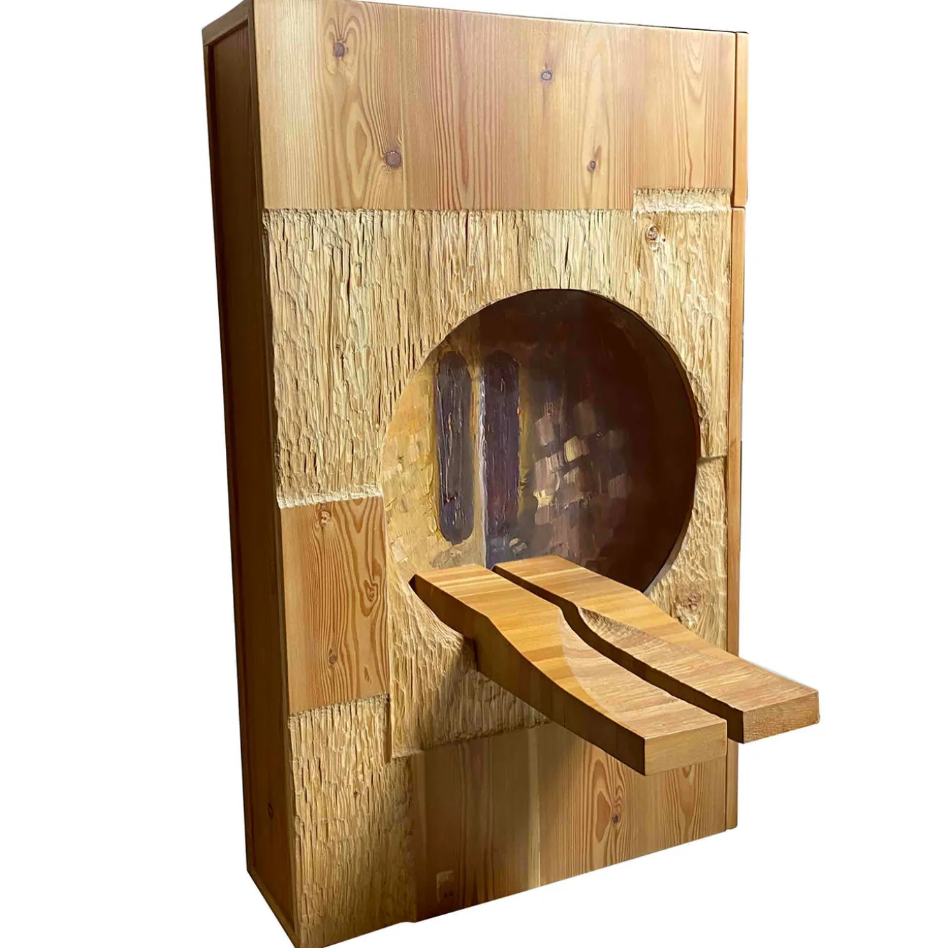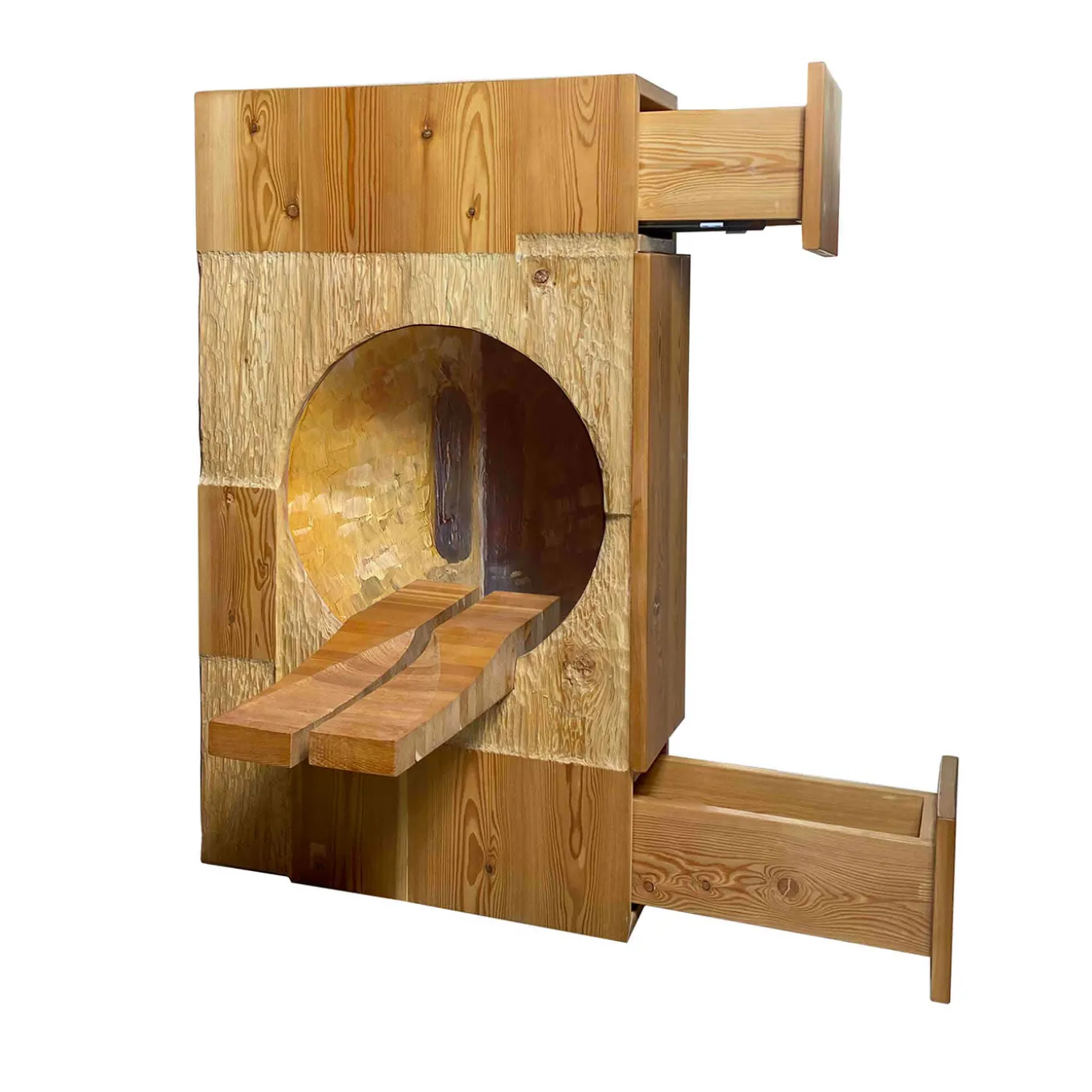 Merging art and design with masterful crafting techniques, this superb sideboard is a 2022 design by Pietro Meccani. Handcrafted of European larch, it features two side drawers and hand-sculptured elements. The hand-decorated backdrop draws inspiration from Ferdinando Meccani’s oil paintings from the ’60s and ’70s. It belongs to a limited edition of 10 numbered designs and can be customized in wood essence and size upon request to the Concierge.