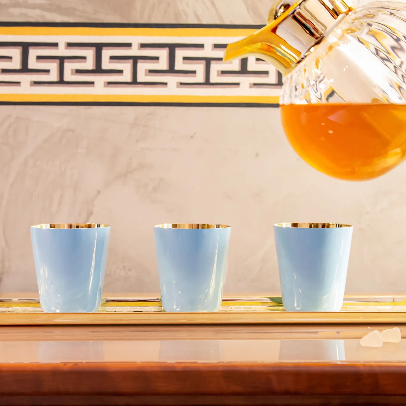 Ideal solution for serving drinks during exclusive private parties, this tray features an elongated design with a curved short edge deliberately lifted to shape the handle. The texture of rectangles adorning the bottom can be appreciated both with eyes and fingertips, a decoration that results naturally enhanced by the general gleaming gold plating.