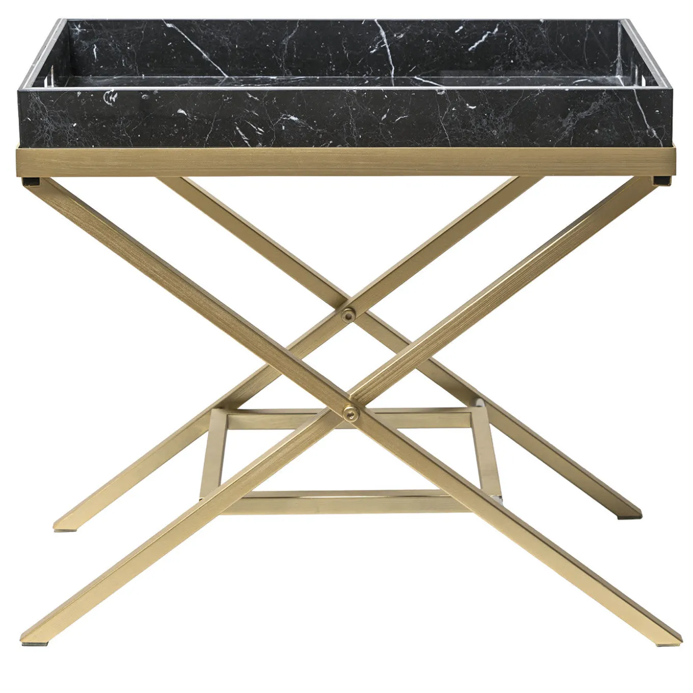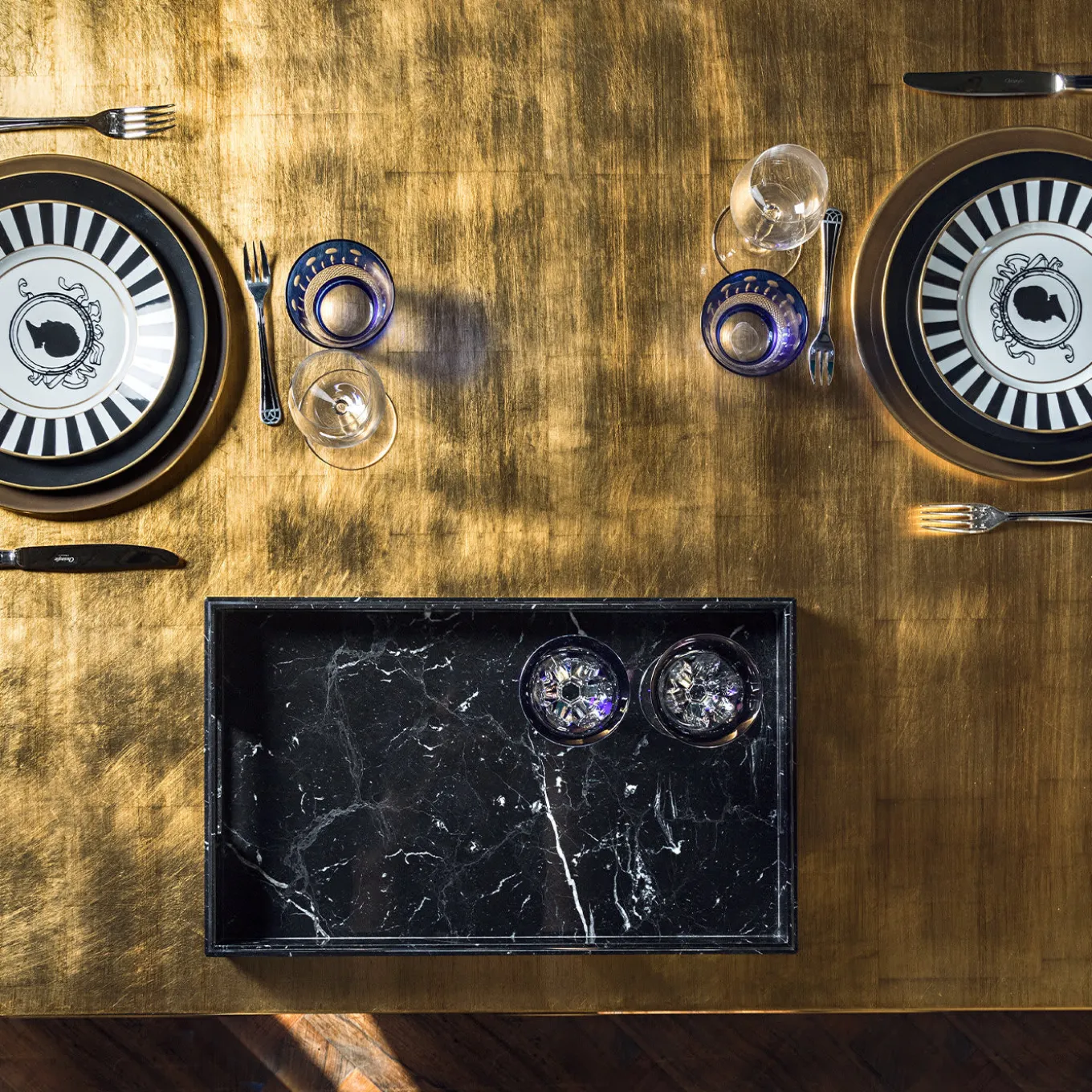 This stylish side table has a removable top that becomes a gorgeous tray, making it an incredibly unique and functional dining accessory. Crafted of prized Nero Marquinia marble, whose magnificent white veins are highlighted by the black stone’s natural elegance, this versatile piece rests on a chic satin brass-finished metal crossed base. This distinctive objet d’art will create a stunning effect, particularly in a contemporary, minimalist dining interior.
