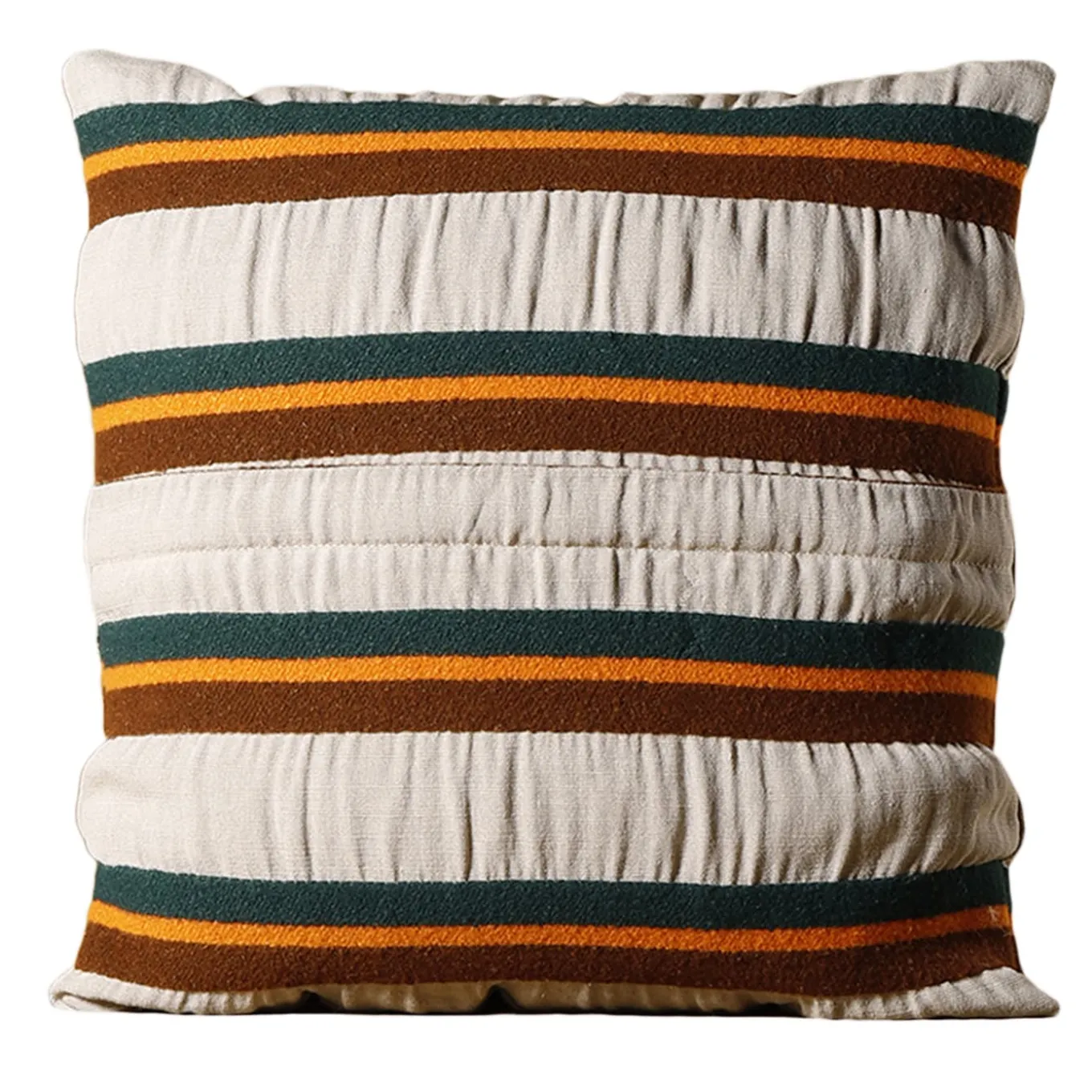 This artful cushion – where beige linen (80%), virgin wool (16), and polyamide (4%) are cleverly combined – is sure to add a dash of personality to corners. Polychrome stripes vividly emerge from the humble beige linen cover, distinguished by an irregular weft that further contributes to its general dynamism. A rectangular version is also available.