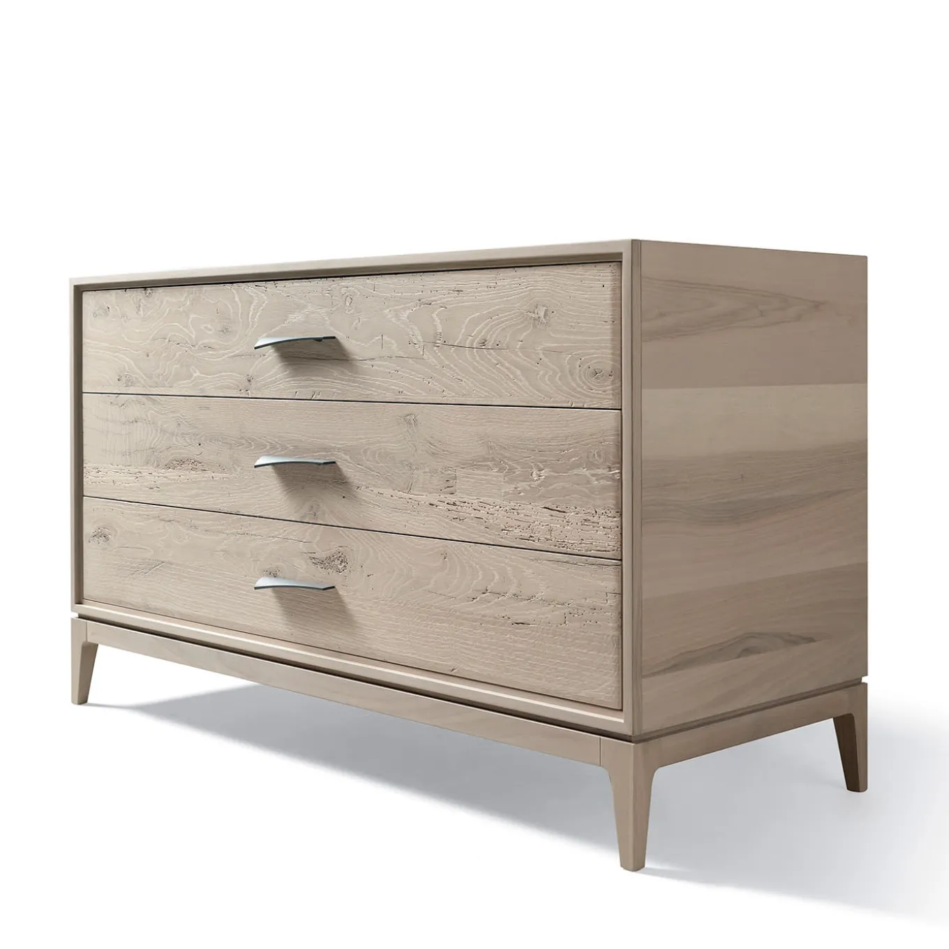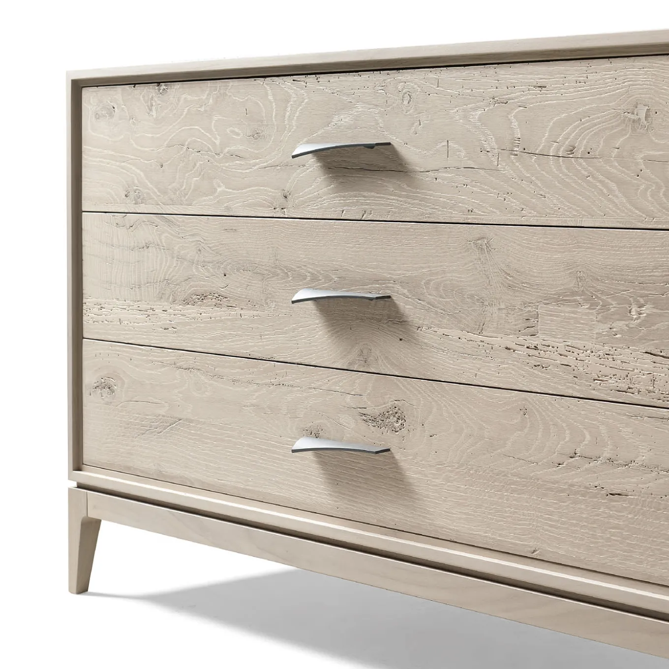 Velo solid wood dresser is the result of passion, skills, and refined craftsmanship. It features a structure in solid walnut blockboard and drawers in antique oak with a slightly inclined handle to add personality to the furniture. Thanks to the quality of materials and their sturdy design, these pieces will live on for many generations to come.